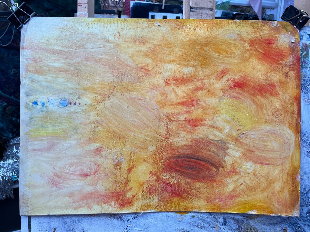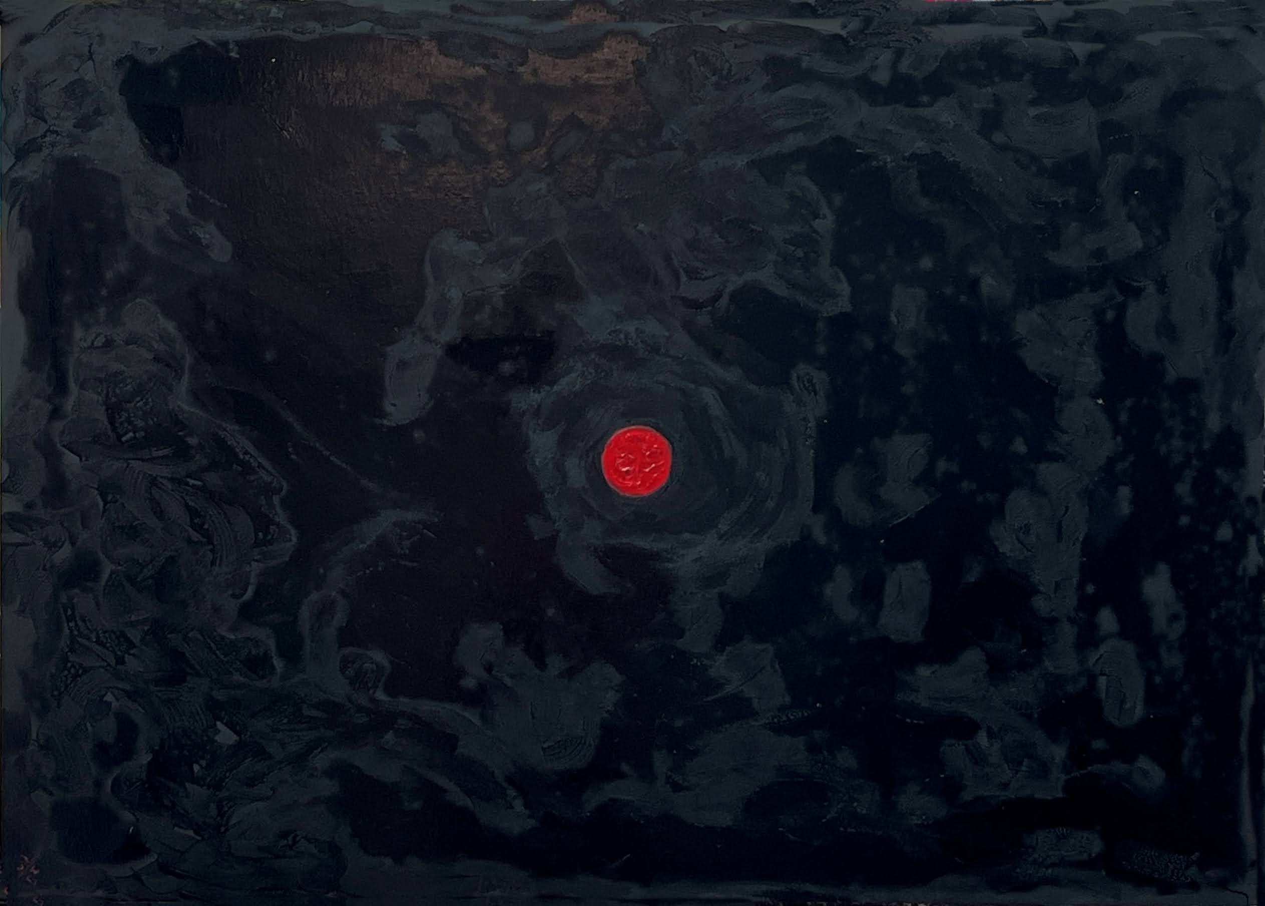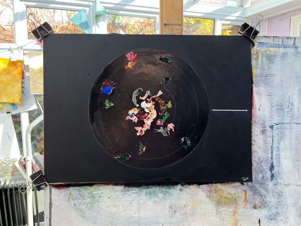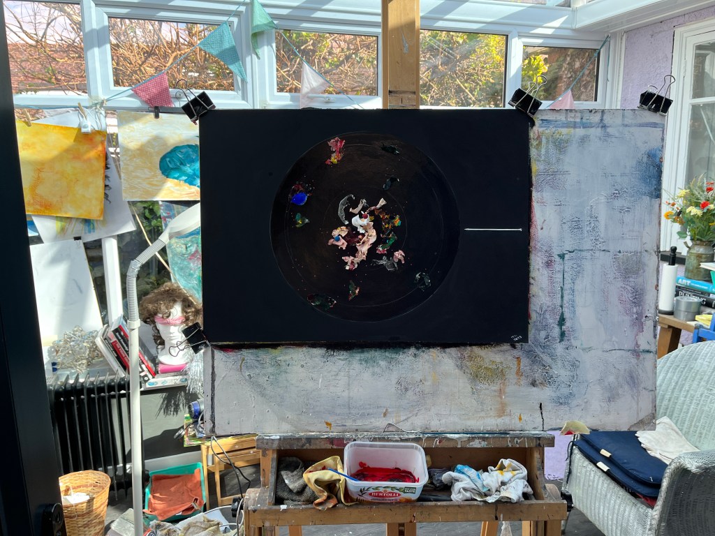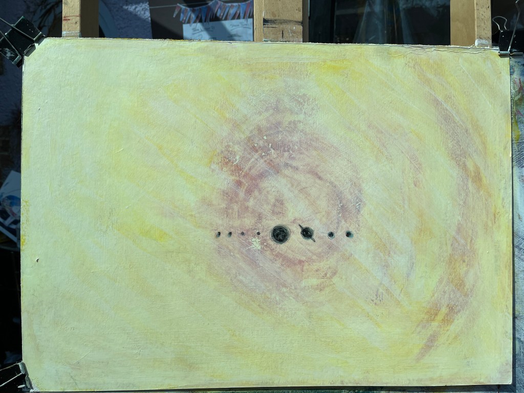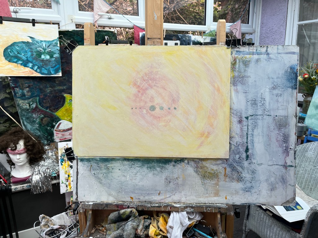 Art, Digital art, Painting, Physical/digital hybrid art Solar system series Young gun sun Oils, soft pastels, and gloss varnish on A2 card. Red dragon Oils and gloss varnish on A2 card. White Nova Oils and gloss varnish with silver foil collage on A2 card. Red dwarf Oils on A2 card with gloss varnish painted into matte areas of the image to echo invisible dark energy. Billions of suns Oils on A2 card with gloss to the central circle and acrylic paint peeled from a palette to imply galaxies. Composite video – Sun’s lament Share this: Click to share on X (Opens in new window) X Click to share on Facebook (Opens in new window) Facebook Like Loading... Related