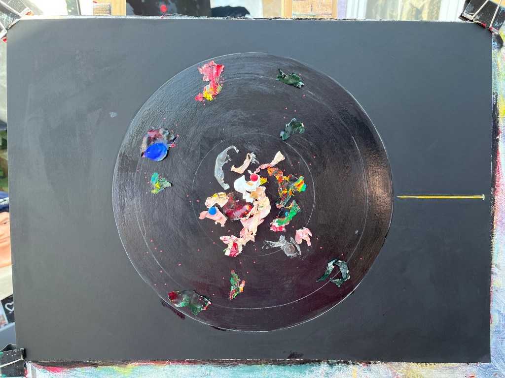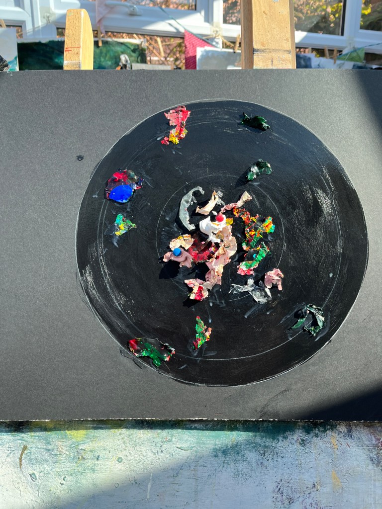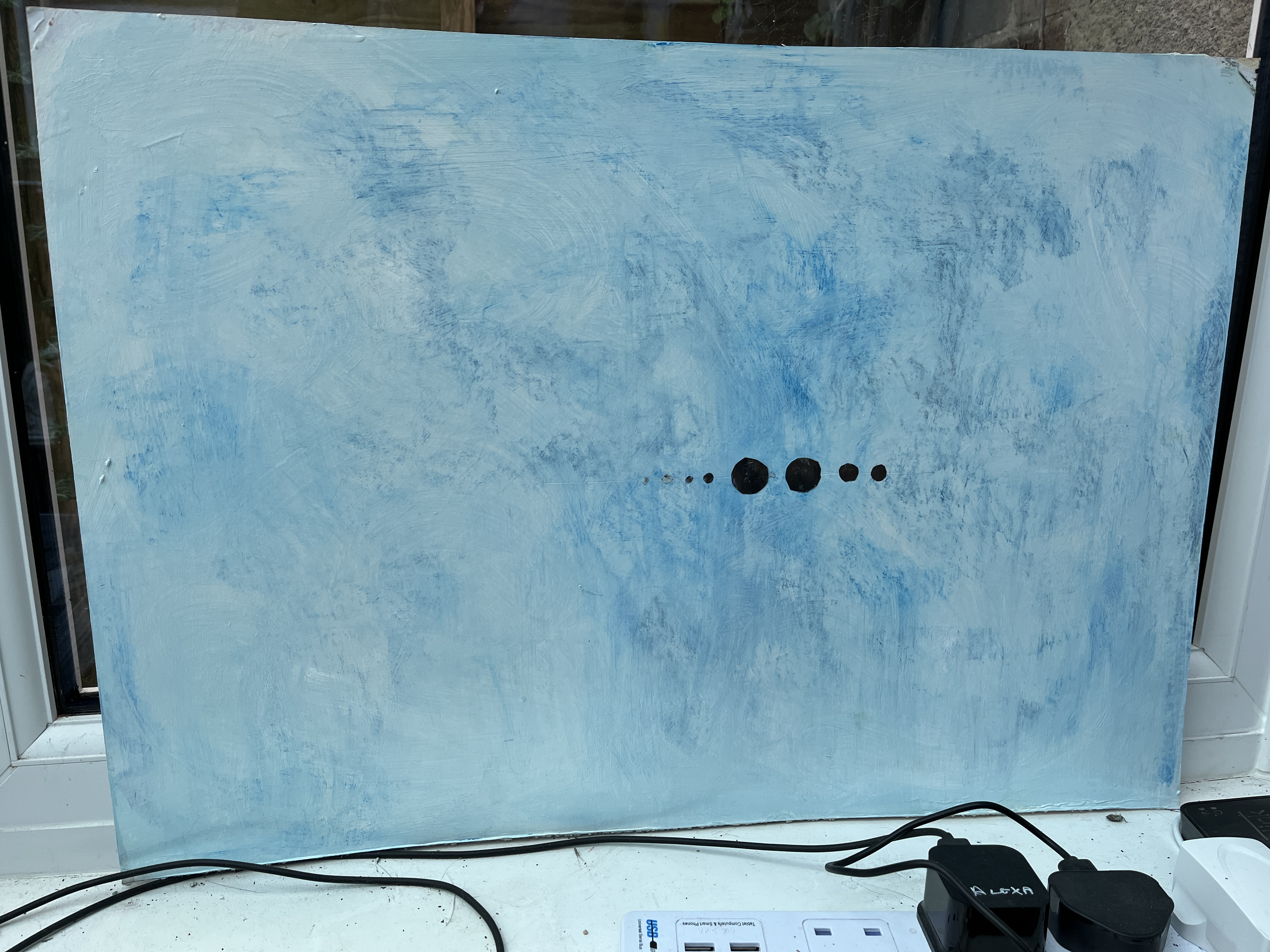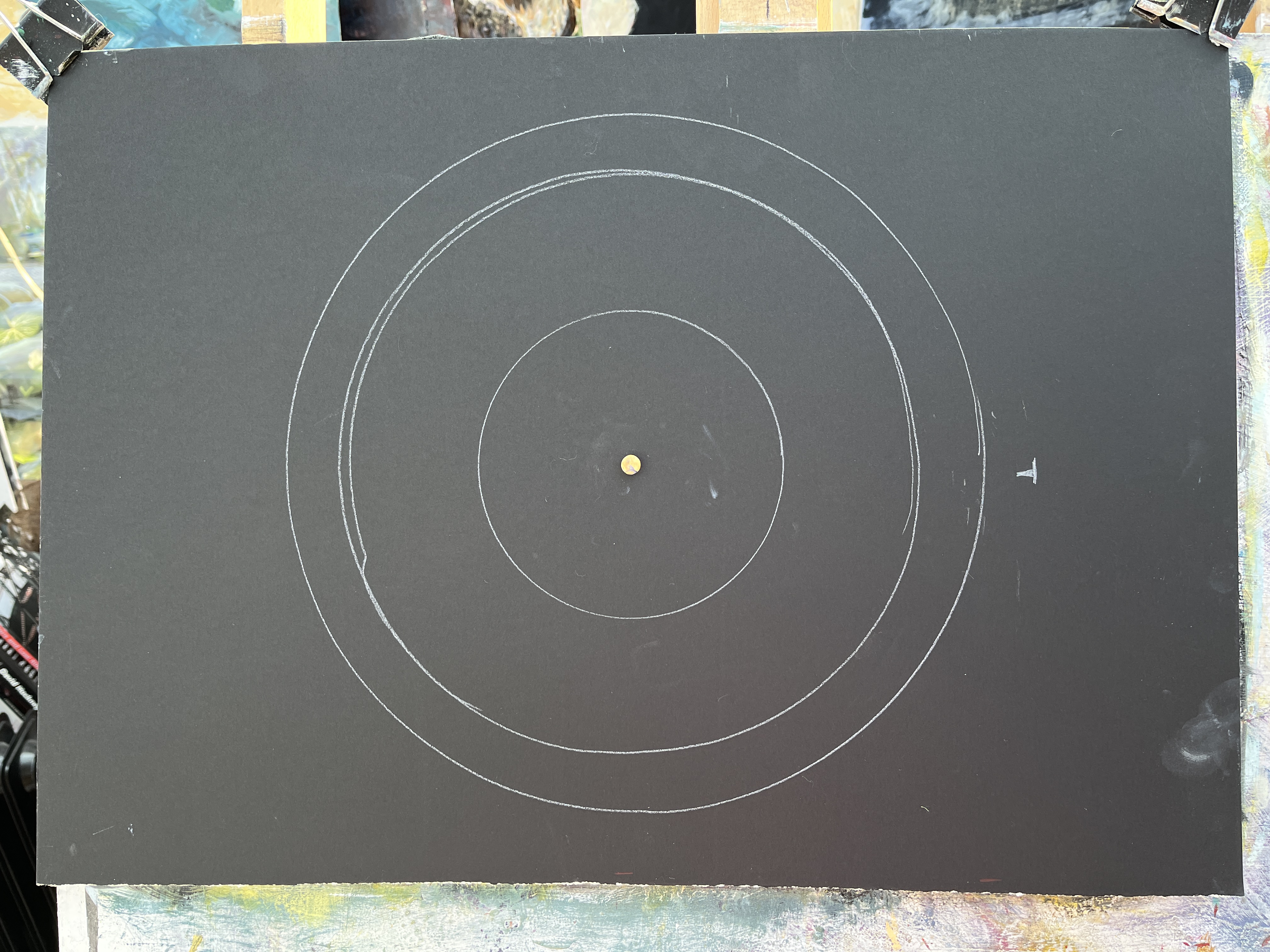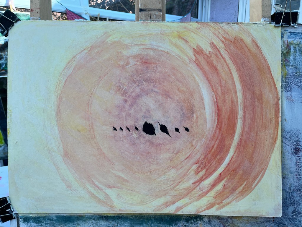 Art, Digital art, Painting, Physical/digital hybrid art Solar system series Young gun sun Oils, soft pastels, and gloss varnish on A2 card. Red dragon Oils and gloss varnish on A2 card. White Nova Oils and gloss varnish with silver foil collage on A2 card. Red dwarf Oils on A2 card with gloss varnish painted into matte areas of the image to echo invisible dark energy. Billions of suns Oils on A2 card with gloss to the central circle and acrylic paint peeled from a palette to imply galaxies. Composite video – Sun’s lament Share this: Click to share on X (Opens in new window) X Click to share on Facebook (Opens in new window) Facebook Like Loading... Related