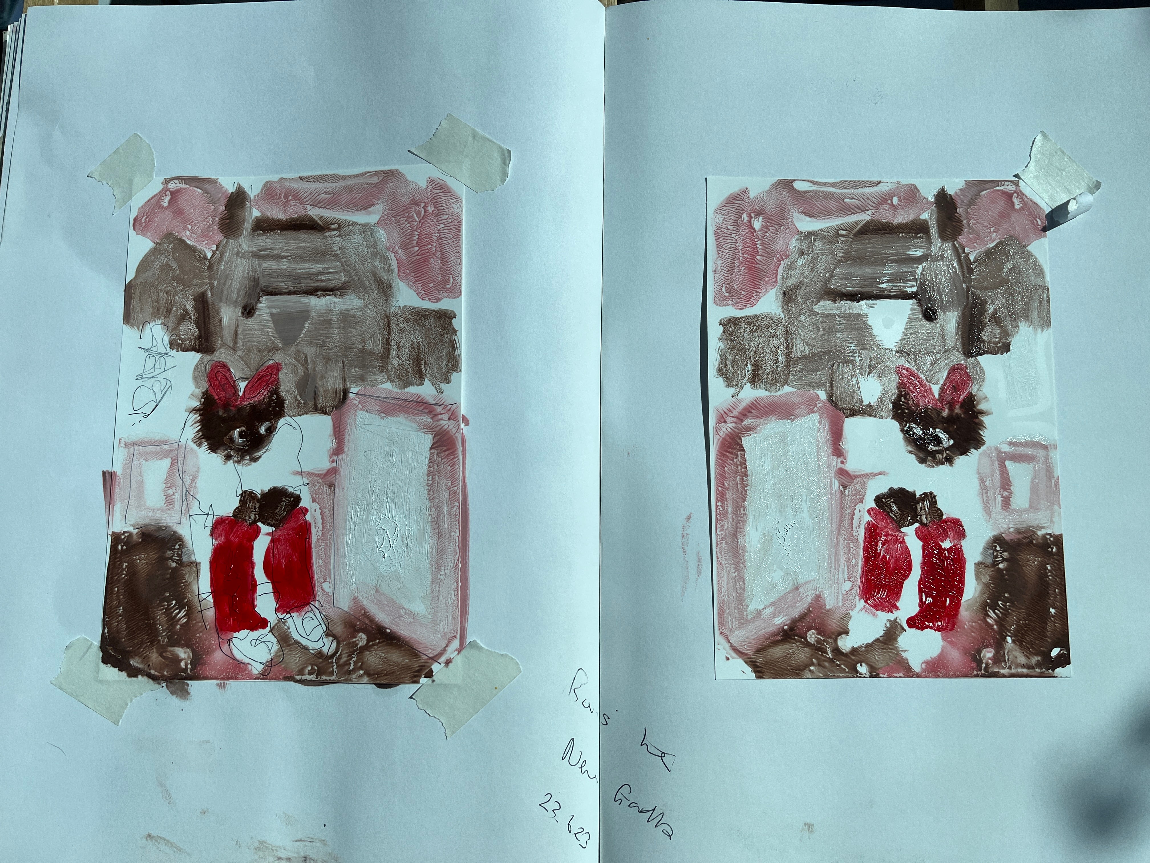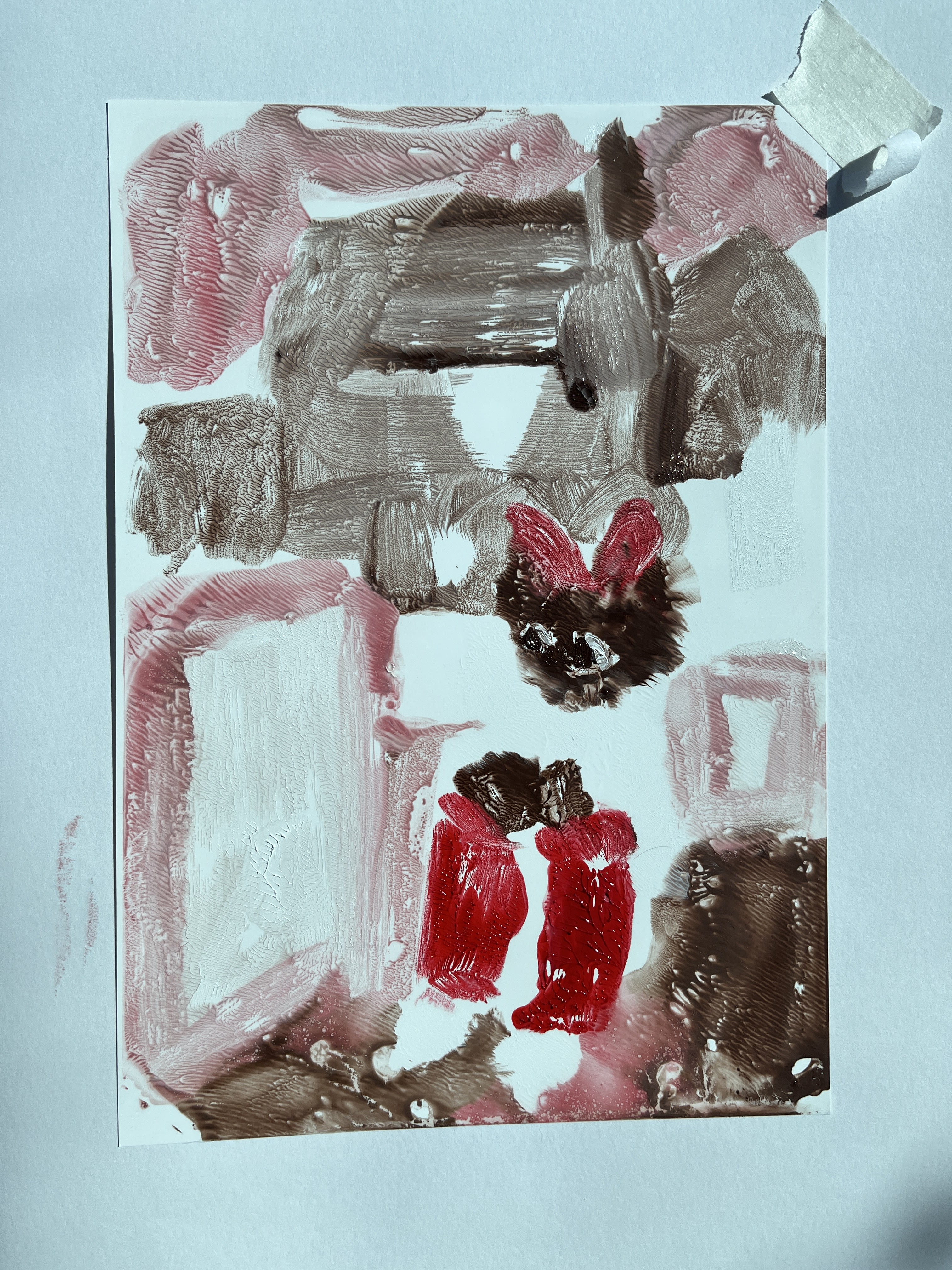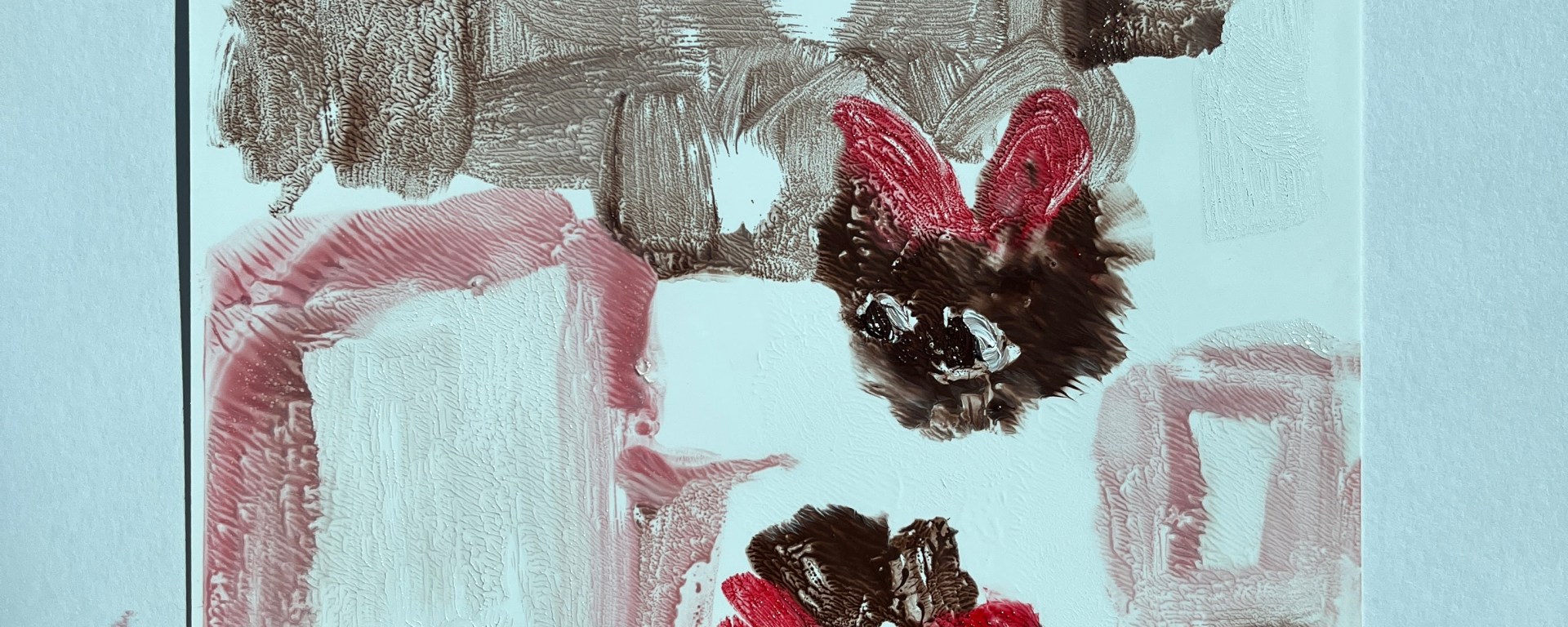 In the meantime, while this is mulling, I had a go at oils on slithery surfaced A5 Yupo paper. The objective, again in line with suggestions from my tutor about trying not to overwork and to leave space instead of always working into it, was to reduce my capacity to overwork and in-fill. This was most evident in my mono-print series and so the Yupo paper plays the part of the acetate but forces me to draw the image rather than apply paint on a transparent surface placed over a photograph.