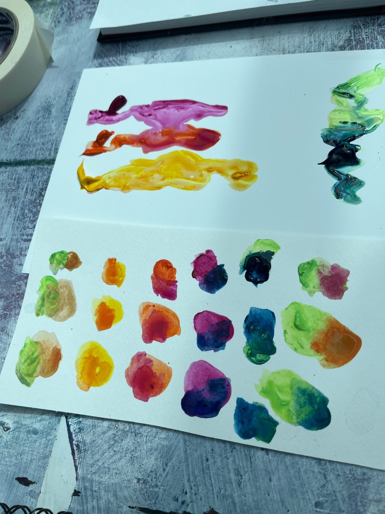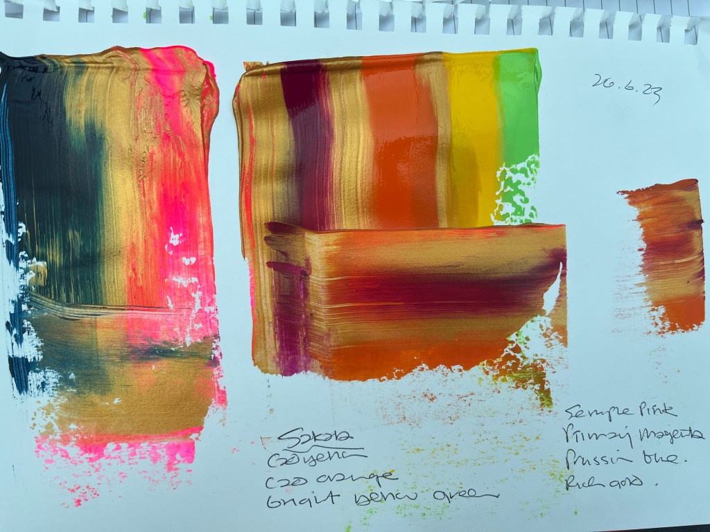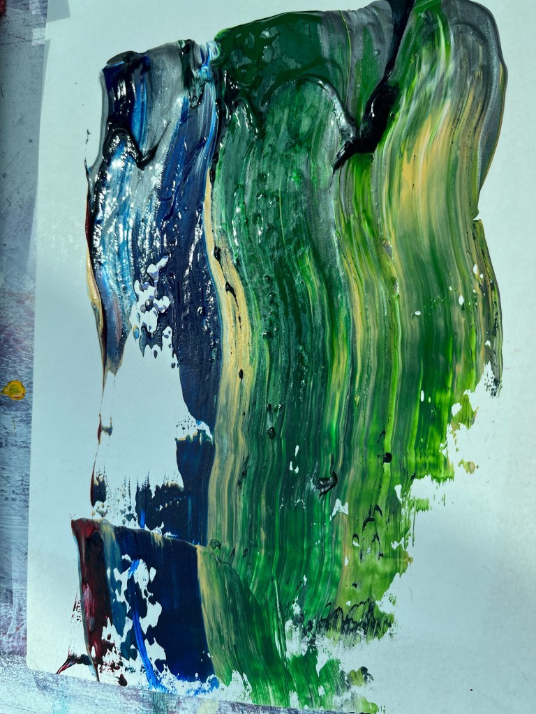 I’m quite taken with the way the solids separate out and leave ring marks as they flood out and gradually dry away from their tracks. The subject of this palette sells textiles, clothing, and artefacts from the Indian subcontinent. The speculative landscape is sky, foliage, and water. I’m interested to see what happens when the acrylic is fully dried out and I can pull some of the raised lumps off the surface. The next experiment will be more restrained and less full bodied.