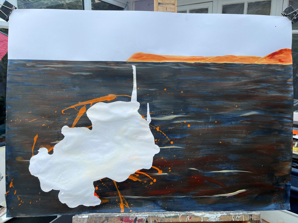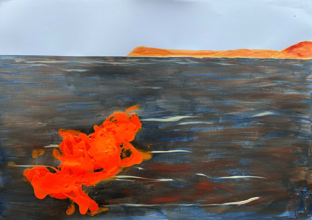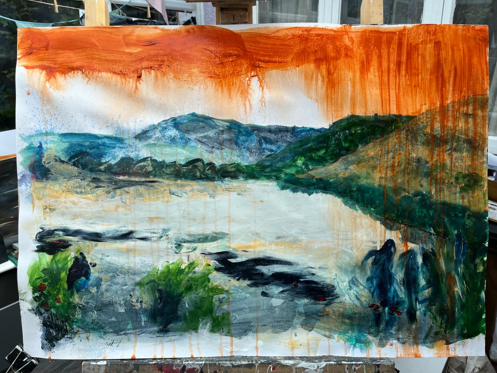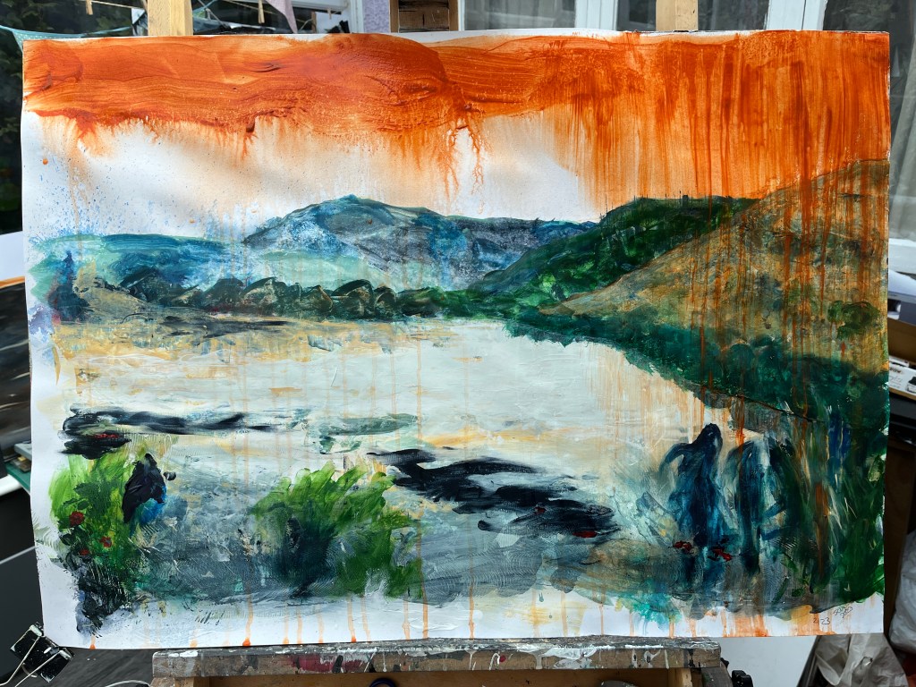 Quite a lot happened yesterday, including despair and near satisfaction about two different paintings. The one above was the despair and the one below the success. Each represents a different kind of protest tactic used by Just Stop Oil – the first confetti, the second soup on a painting, which wasn’t harmed. The third was to be a puddle of orange in the middle of the dark stretch of water now filling the river valley where the shrubs and grasses were, but I found it hard to make regular acrylic paint fluid enough to pool while still being controllable. Too late, I remembered about pouring paint and ordered some.