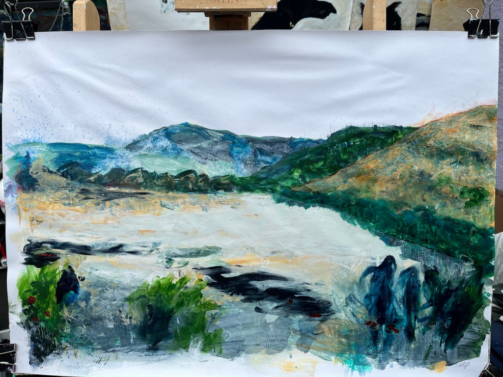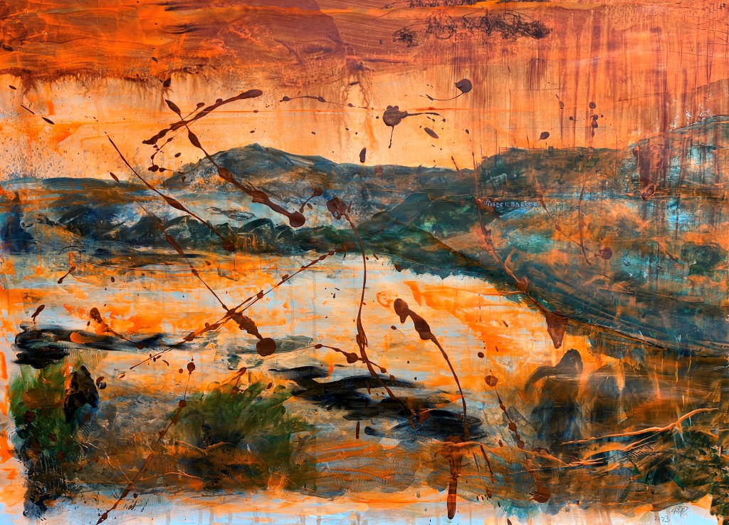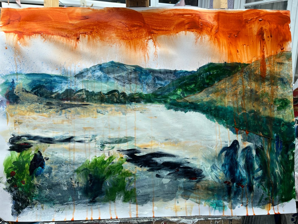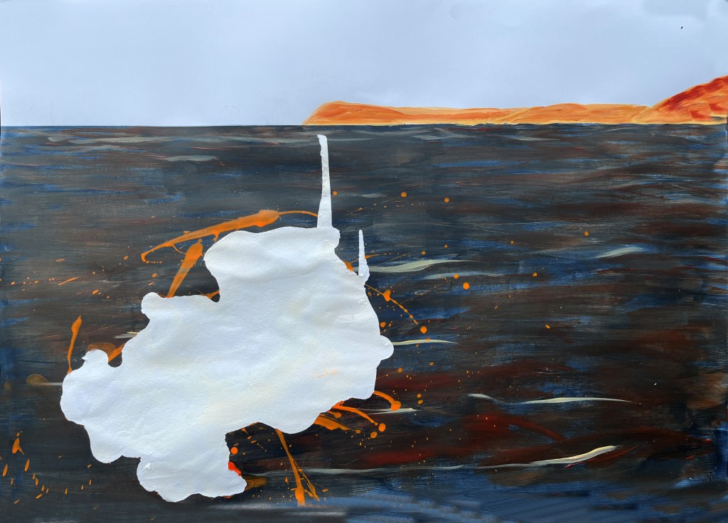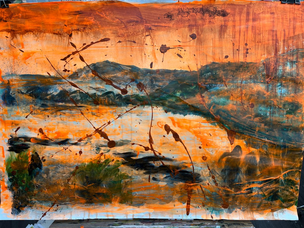 Quite a lot happened yesterday, including despair and near satisfaction about two different paintings. The one above was the despair and the one below the success. Each represents a different kind of protest tactic used by Just Stop Oil – the first confetti, the second soup on a painting, which wasn’t harmed. The third was to be a puddle of orange in the middle of the dark stretch of water now filling the river valley where the shrubs and grasses were, but I found it hard to make regular acrylic paint fluid enough to pool while still being controllable. Too late, I remembered about pouring paint and ordered some.