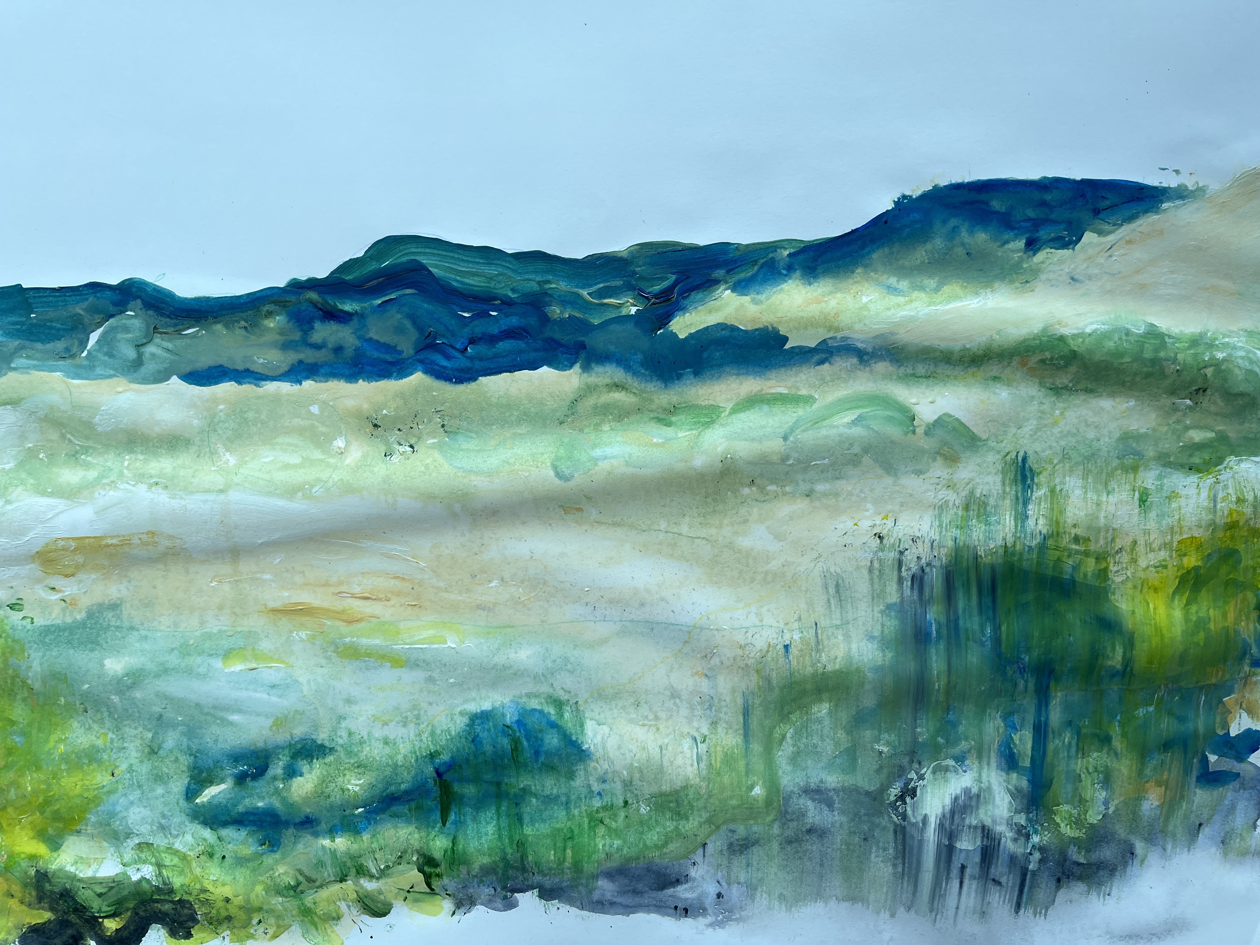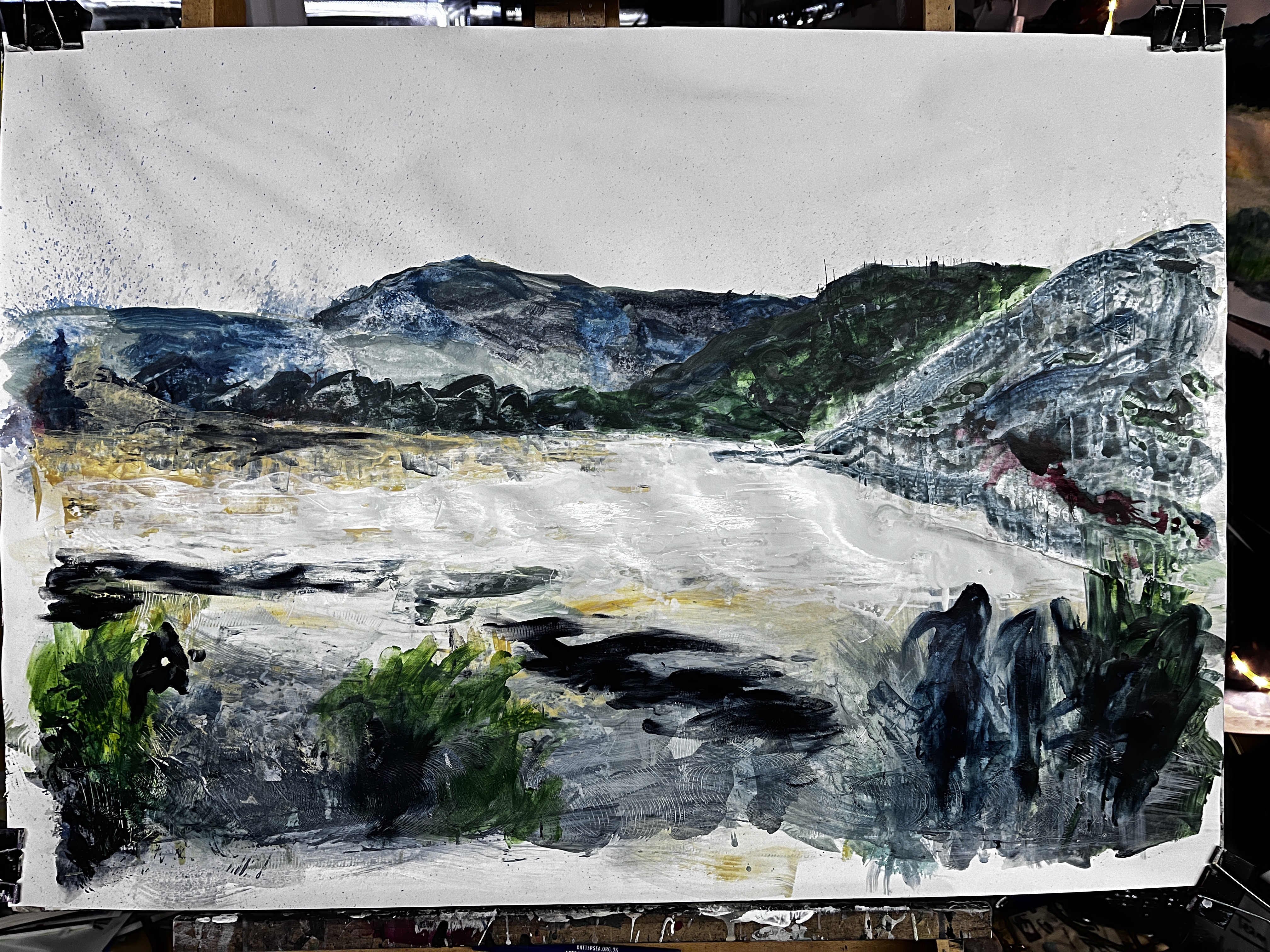I’ve used an A1 cartridge surface, untreated, on which I drew out faint lines of the various key features in the landscape. Then I sprayed the whole with water and applied dilute white paint within the shapes of those features.