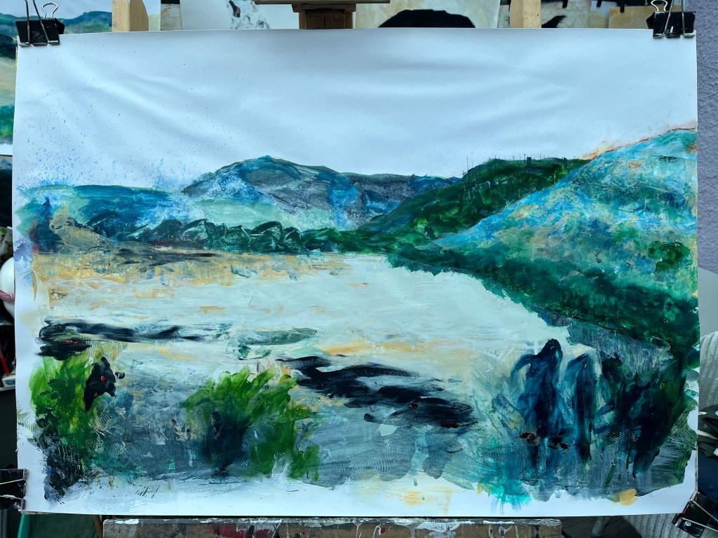I have somehow made a tree line along the water’s edge and unknowingly positioned reflections. That darned hillside though ..!