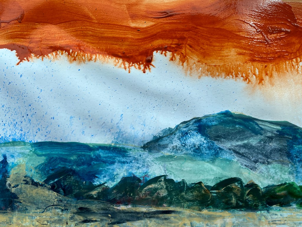 The first issue was structural – I didn’t like the horizontal ‘frame’ at the bottom so I washed some of it out and changed the shapes of the others so they had a less literal foliage stamp to them. Then, having figuratively set fire to the slope on the right, I tried to minimise that while leaving some of the red in place. By last night, it had become quite post apopcalyptic but with a strangely textured hillside drawing my eye unnecessarily.