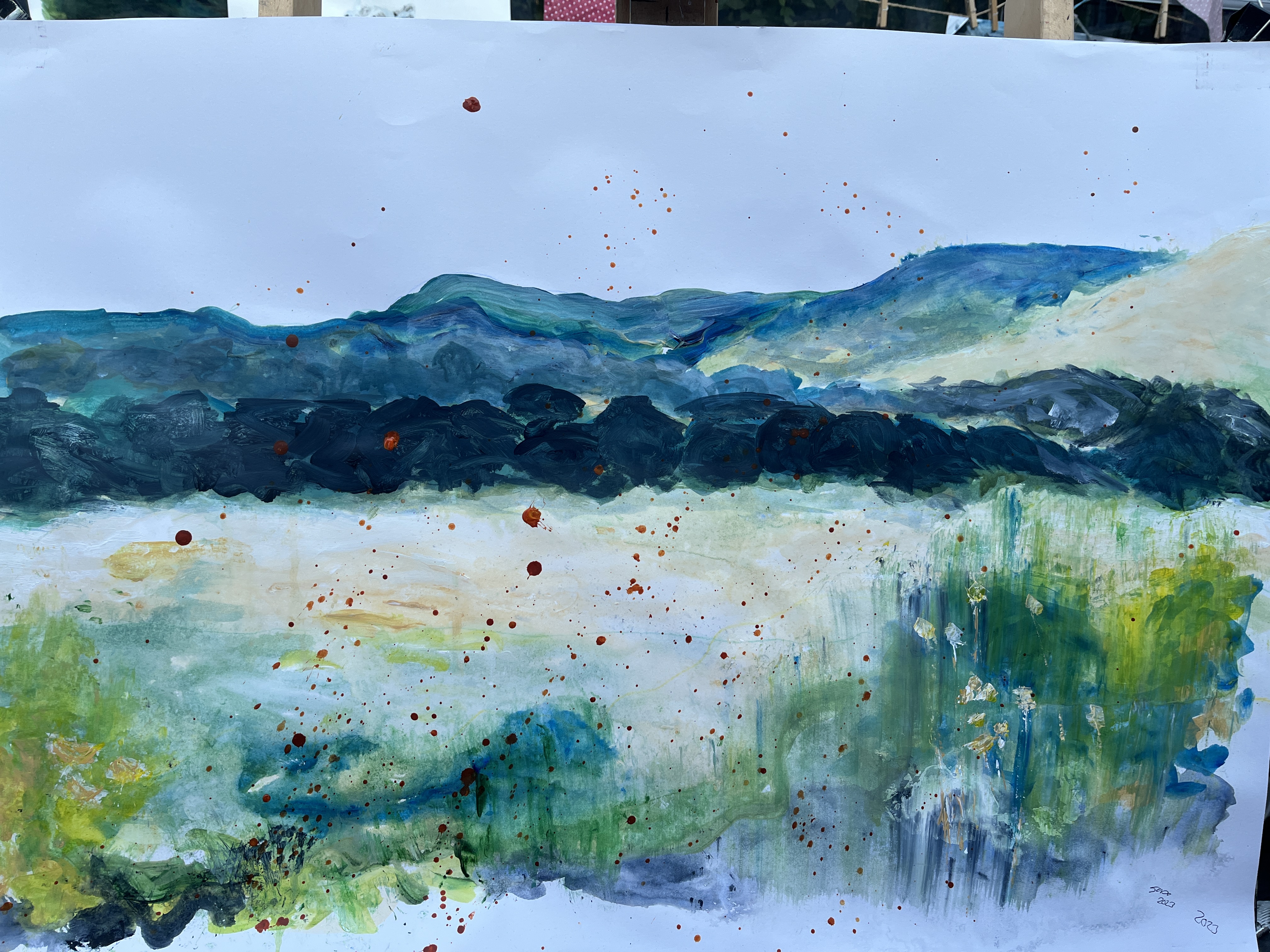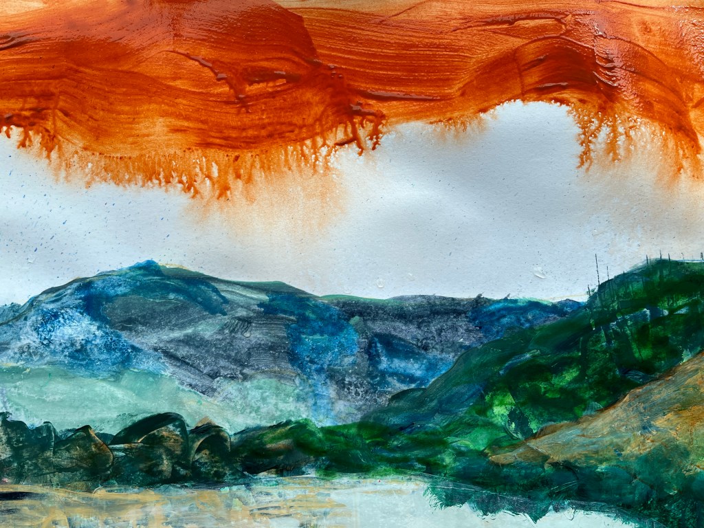 2023. Our valley; green and yellow with life buzzing in every square inch. But the warning signs are there – see the orange pointillistic dots; the pox on the face of beauty? This fierce orange is the motif of our stupidity.