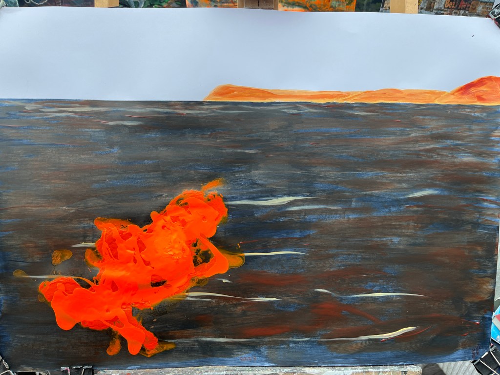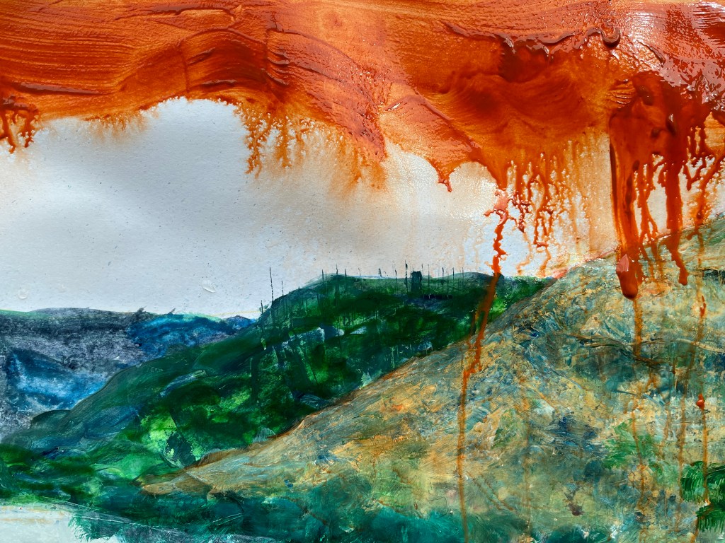 23rd July and the underlying climate theme asserted itself. It’s taken its time, is all I have to say. Going with the #JustStopOil theme, I’ve variously dripped, flicked, and puddled dark orange (and possibly riotious pink, I haven’t made my mind up about that) onto the three stages of urgency. The first – a few splashes onto the original painting – reflects the use of confetti in the protests; the second drips and splashes curtains of dark orange from the top and across the painting; and the third, which I think cries out for pink but we’ll see, will hopefully dominate the painting. I have photographic and video records of the dripping process, and photos of the others as those happened too fast for me to operate the camera at the same time as making the marks. I’ll put the videos and probably some of the images into a single film.