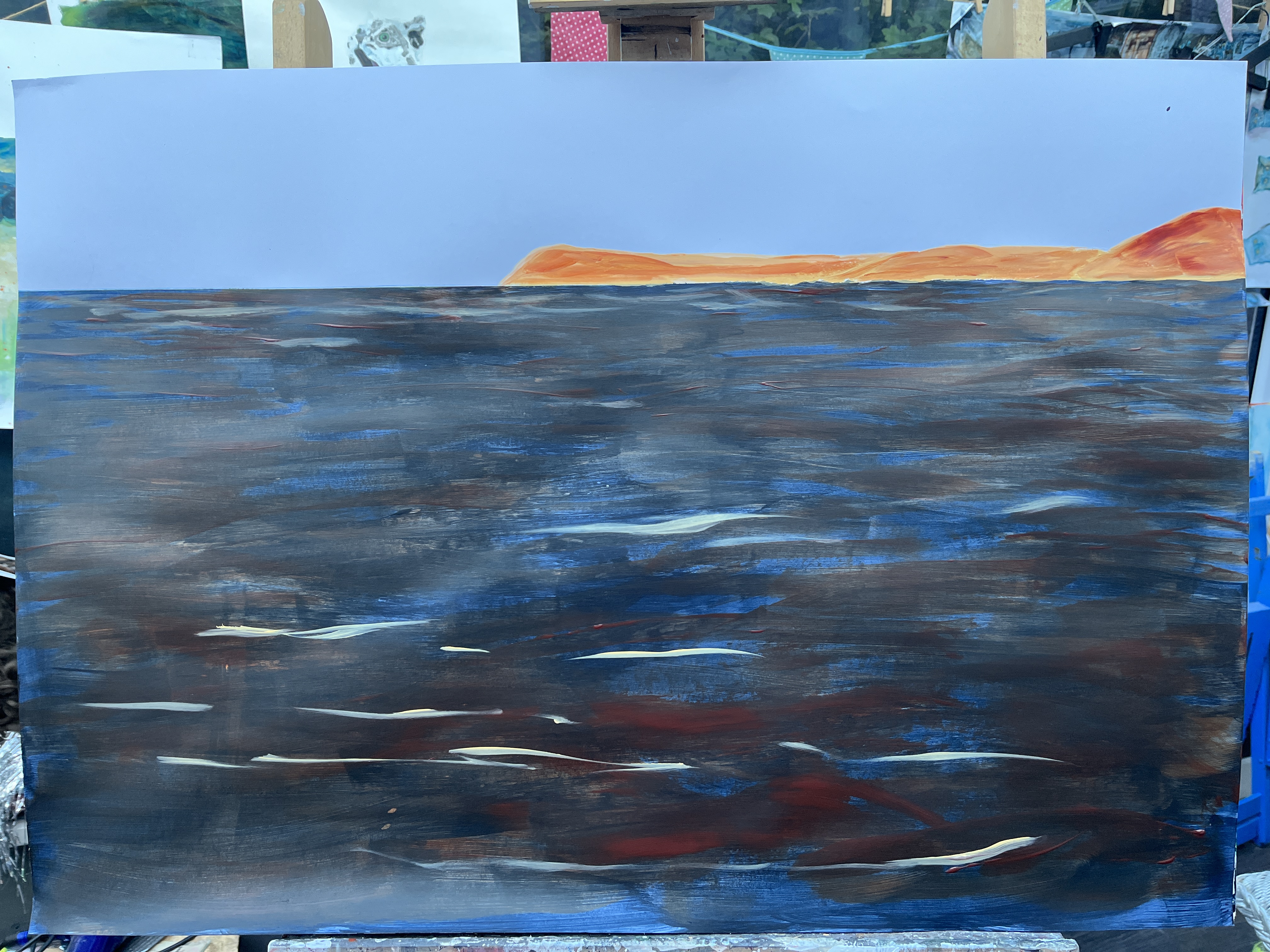 This, I think, is the final stage for the second painting where the pouring paint helps to form the grim backdrop to large ships on the waterway that used to be our green valley. I’ve drawn on the tankers that come in and out of Duluth harbour for these faintly suggested, barely visible ships which I’ve marked out in biro like a technical drawing. The largest of the two here is the James R Barker which has a horn capable of rattling your teeth and which I am hoping to record for the video I’ll be making. I’m really very pleased with the brightness the pouring orange adds to the darker orange beneath, and the lift it gives to the blues which, although originally hillsides, seem to become quite metallic when partially exposed here. I can almost believe a tiny bit of Streeton’s light has made its way through the water here.