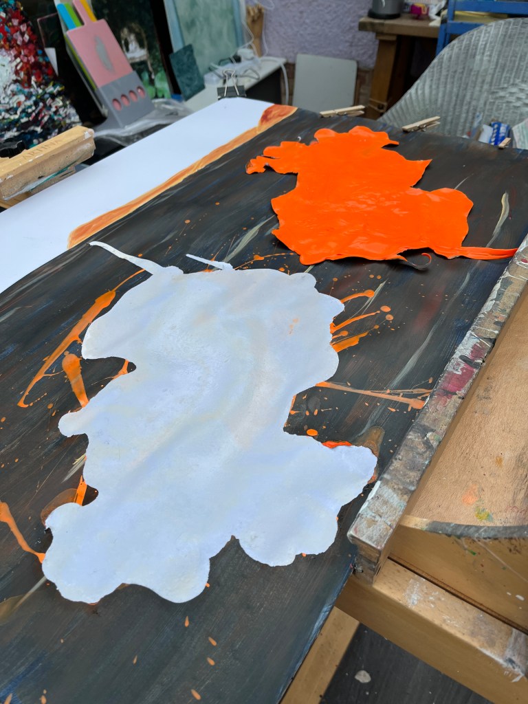 I’m not able to sit this one upright yet as it’s still quite fluid. The pouring paint, which is almost neon in colour, lies on top of the orange acrylic I applied earlier and I really can’t wait to see it full on. This ‘flood’ of orange represents JSO’s wash of orange fluid they have sprayed on windows in the City.