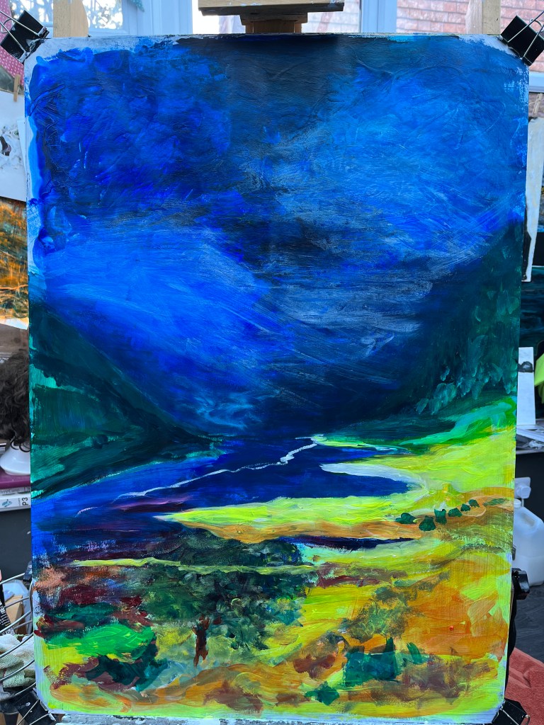 So this is where I put that ‘how it started … how it turned out’ caveat because starting is one thing I know I can do but stopping before I’ve killed it is another matter altogether. That said, when an early iteration of a landscape looks like an ultrasound scan, (and don’t get me started on the Freudian symbolism of the tree), this is not the point at which to down brushes!