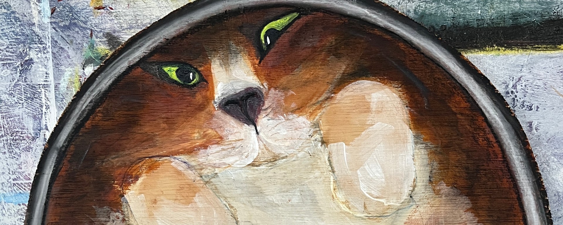 The second version looks to me much more like a container, and the slight internal flattening top left of centre ‘explains’ the eyes. Somehow or other this cat has worked its way into a tin and sees me as responsible for that.