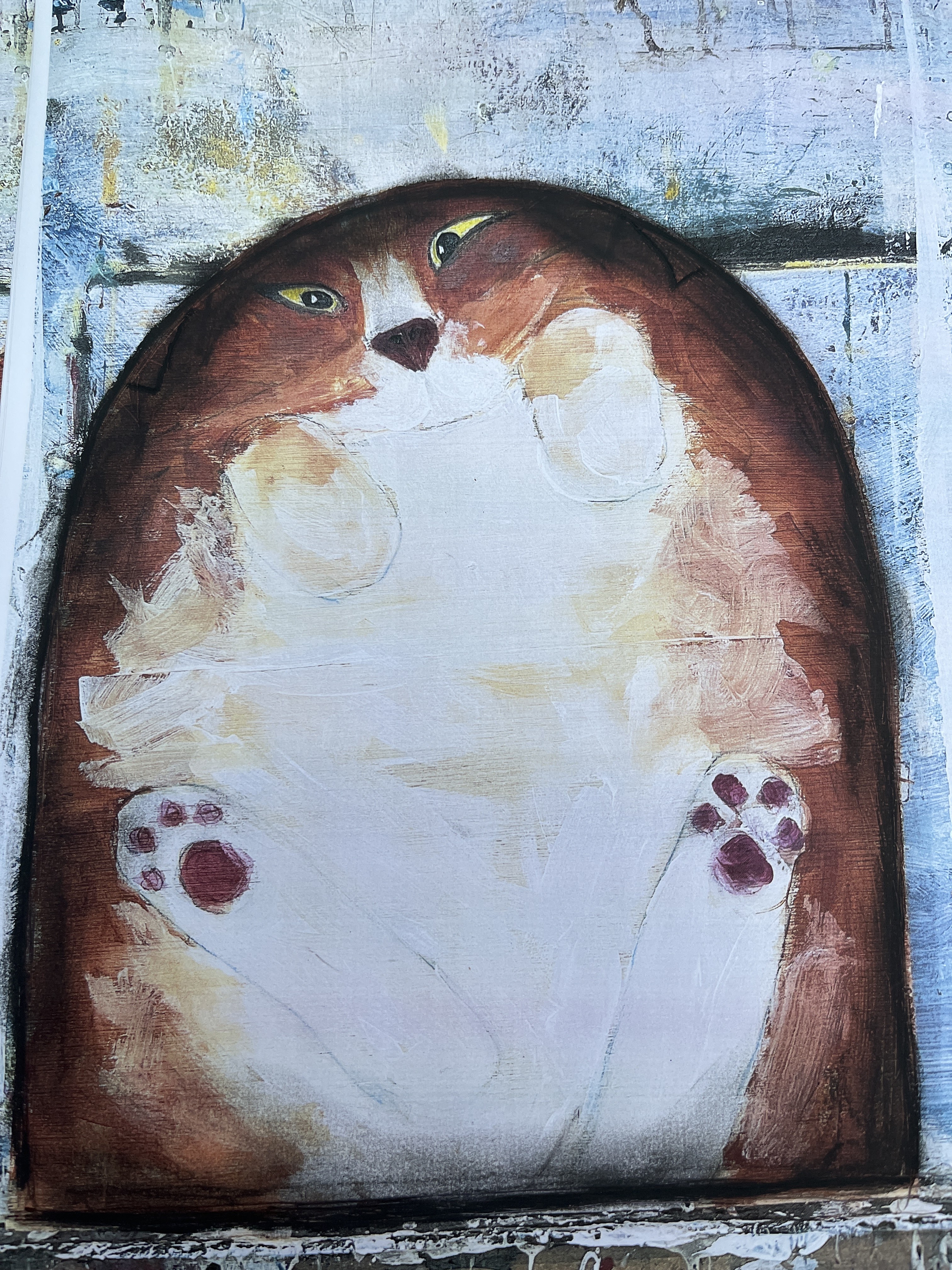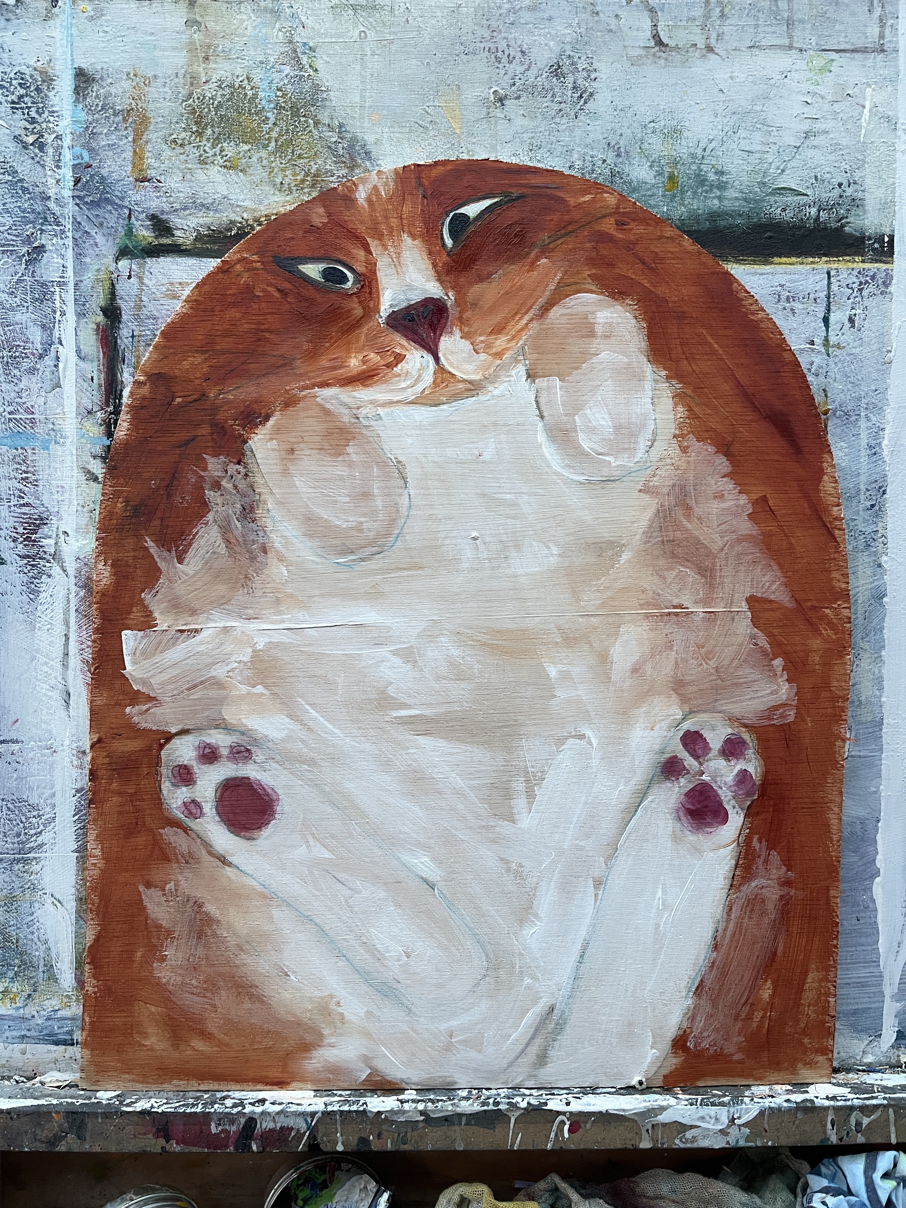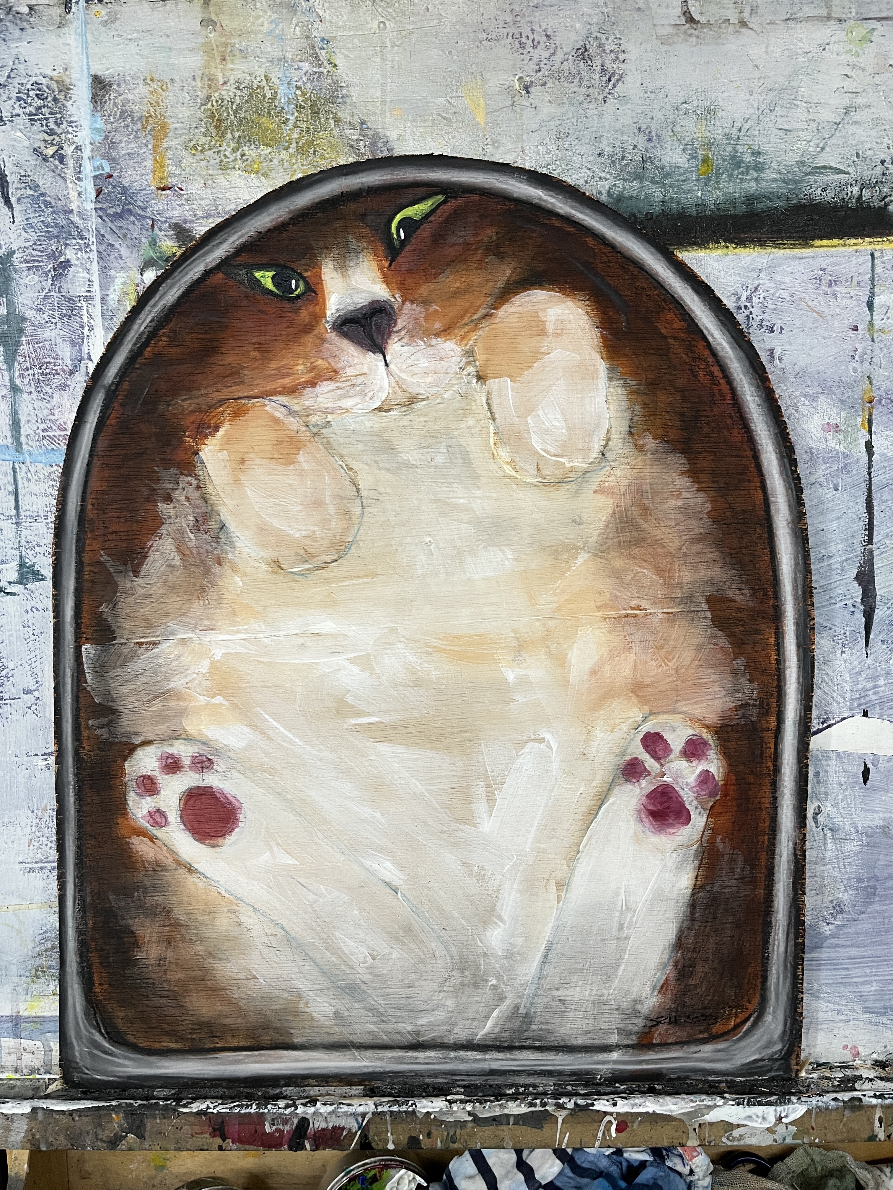 I don’t know who to credit but the cat is doing something I’ve seen so often with my own. Inside out, upside down, spread marmalade thin on a shelf, all of that. So I imagineered a box no one in their right mind ever made and poured a cat I haven’t got into the middle of it where it spread out like ginger dough.