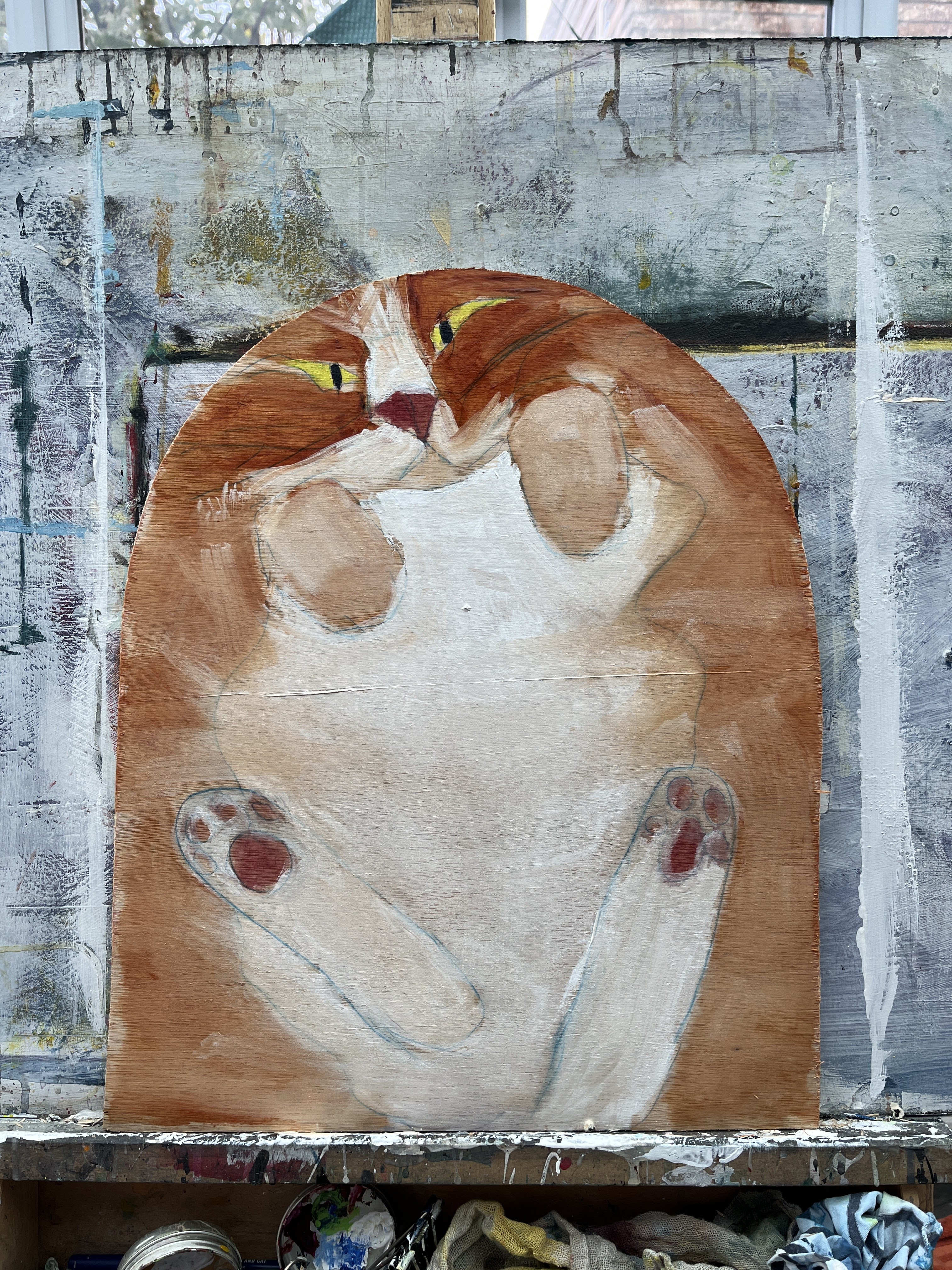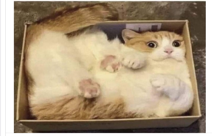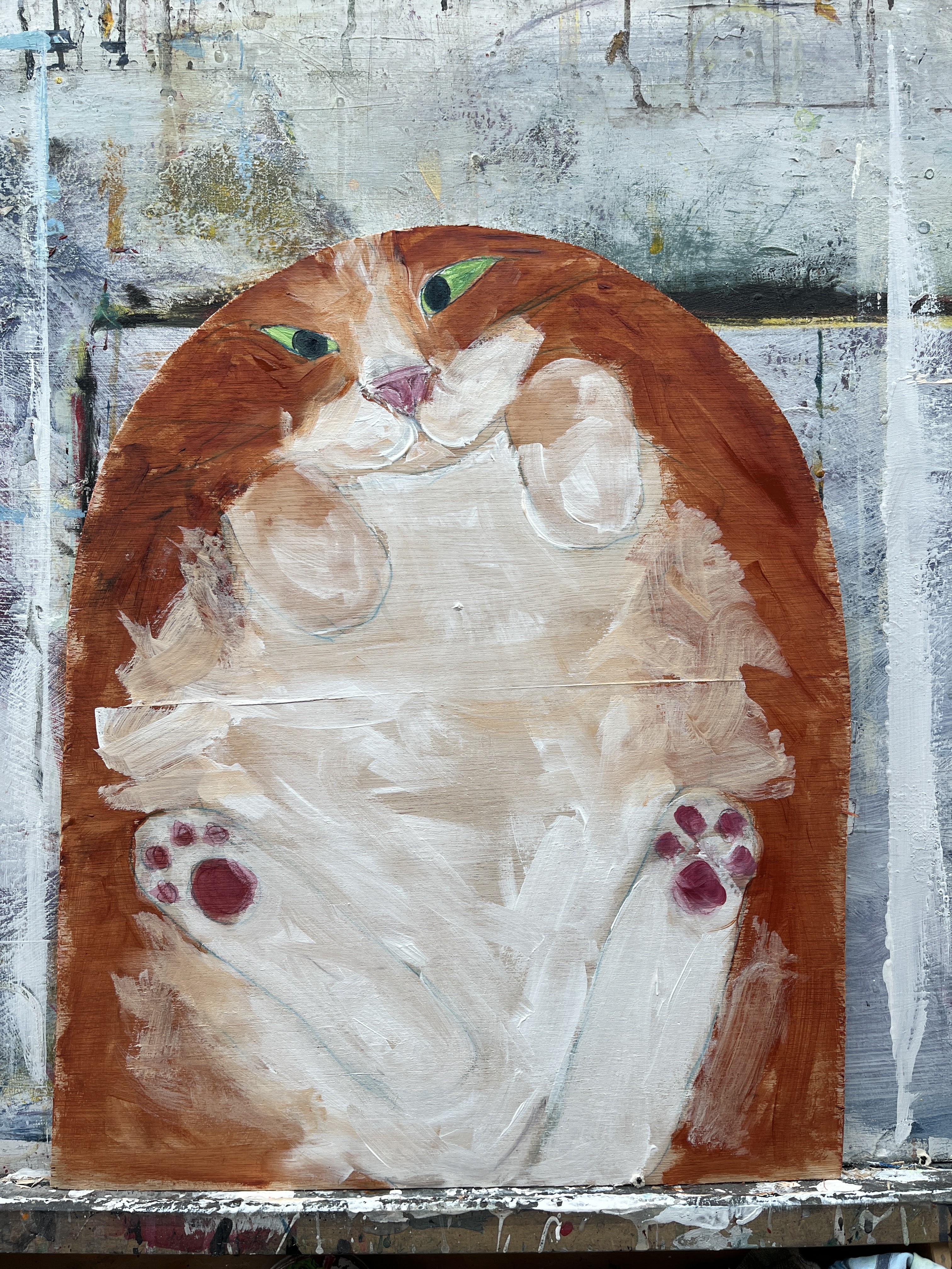 I don’t know who to credit but the cat is doing something I’ve seen so often with my own. Inside out, upside down, spread marmalade thin on a shelf, all of that. So I imagineered a box no one in their right mind ever made and poured a cat I haven’t got into the middle of it where it spread out like ginger dough.