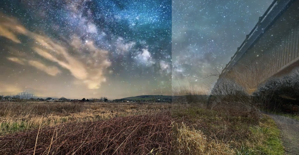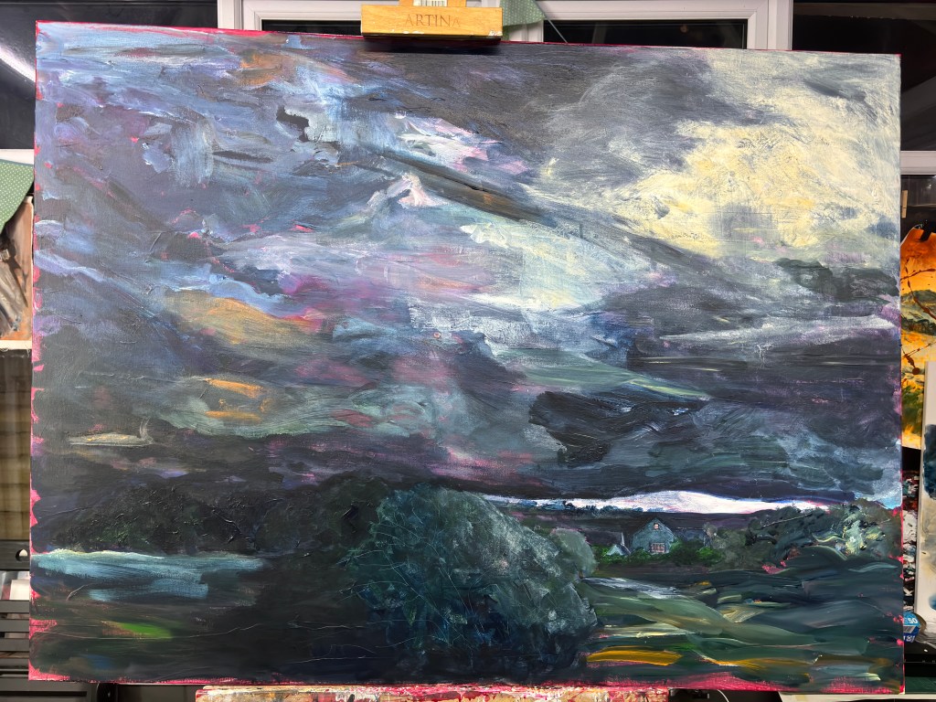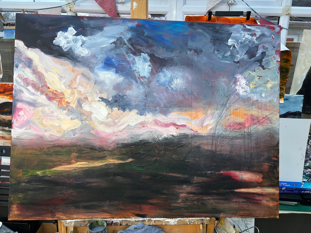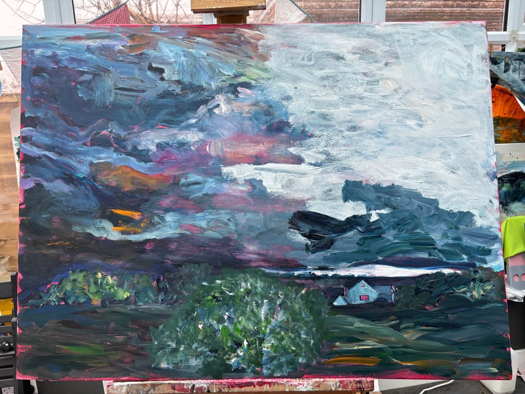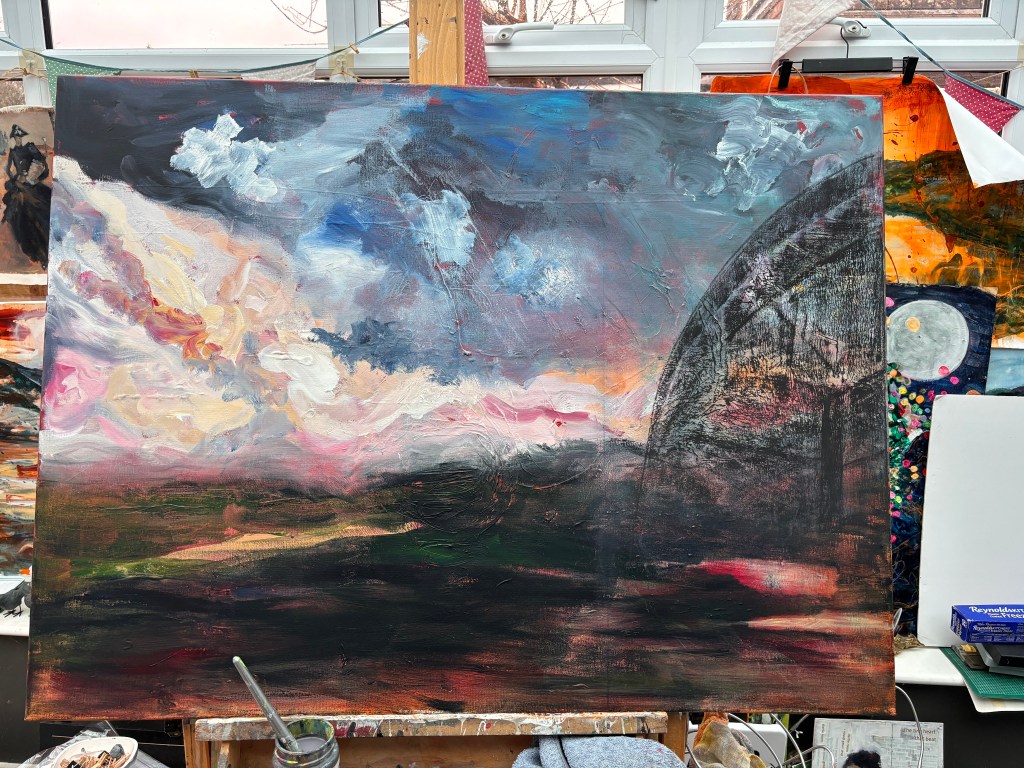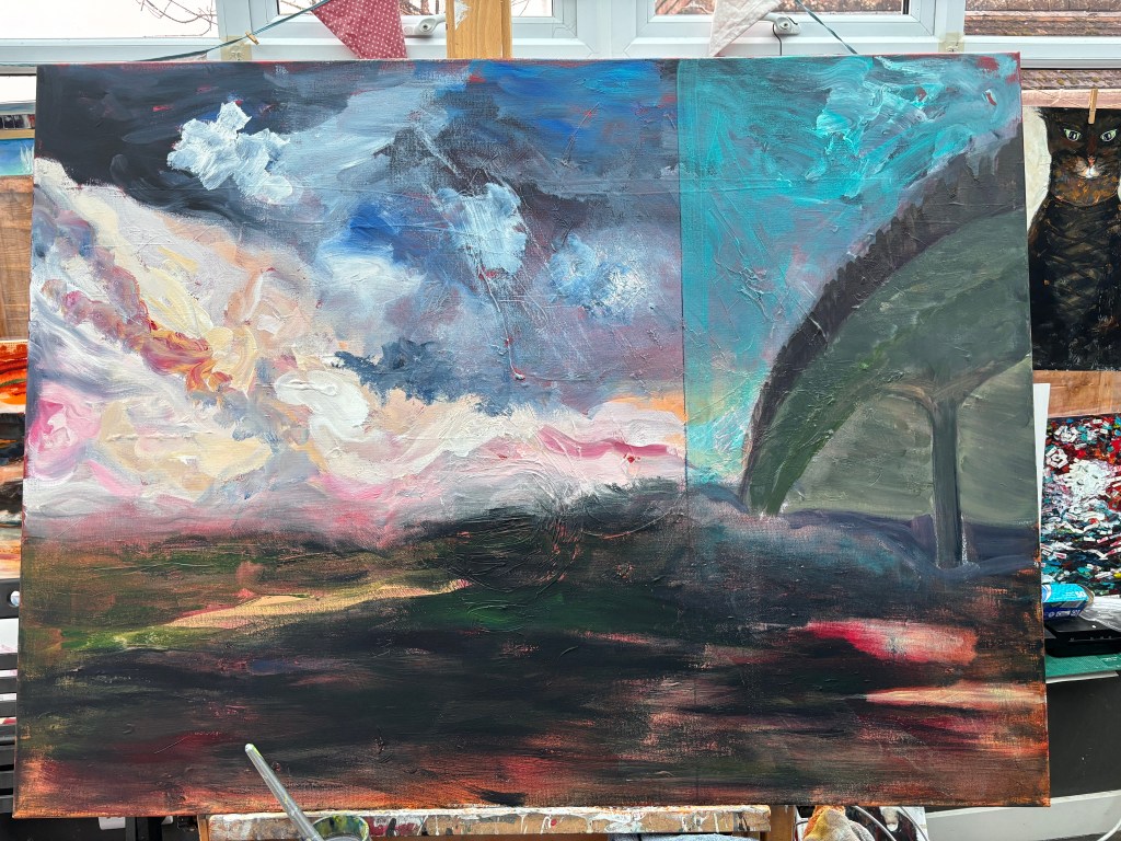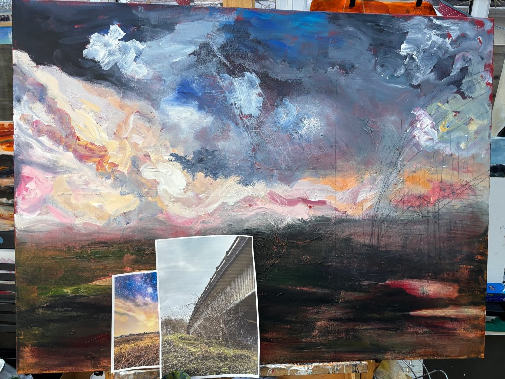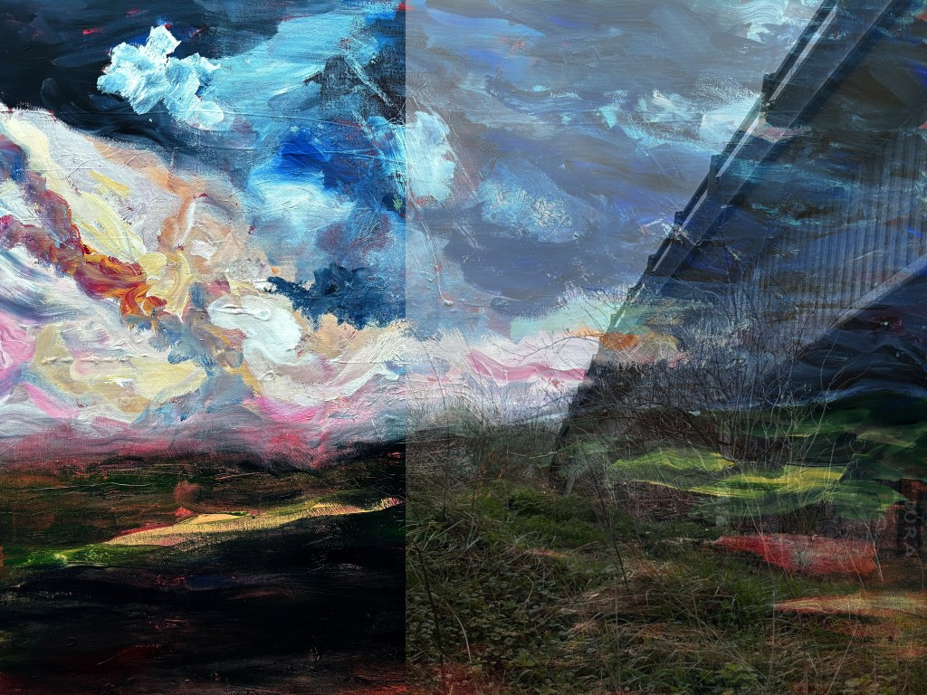 Base image, overlay image, final image. The last one edited in MotionLeap to show a fantasy sky. This was my model for the painting although my attempts to include the bridge failed because everything I tried brought it forward instead of pushing it back and ghosting it. I made the decision to let the landscape standalone until I had a better idea of what I was doing and run some practice pieces. These are the iterations below. The final image is slightly enhanced in PaintshopPro to compensate for my camera’s tendency to crank up the white balance on dark images, and includes the bridge as a photographic overlay via PhotoDirector.