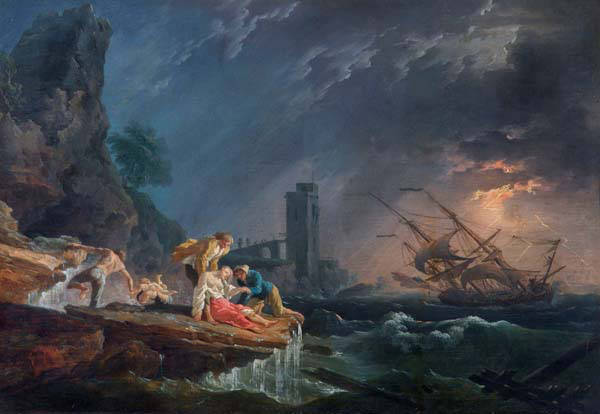 His ‘Nocturnal Seastorm’ (1752, mislabelled in Wolf’s book as ‘Nocturnal Snowstorm’) caught both my drama eye and my colour eye, as well as displaying a massive skyscape above very small figurative objects in the foreground. He would have made epic film backdrops and had the sound effects people crashing pans together till the handles fell off. This link leads to the image which can be popped out into a larger viewer and from this, while also registering the turbulence he has built apparently in layers through which each has a ‘window’ onto a lighter area of sky, I can take a guess that he was right-handed. I’m taking that view because of the diagonals in his work, all of them right to left with the thrust of the energy coming from the top and powering through the painting towards the bottom left. My skies go the other way; I am left-handed. The same goes for Loutherberg below.