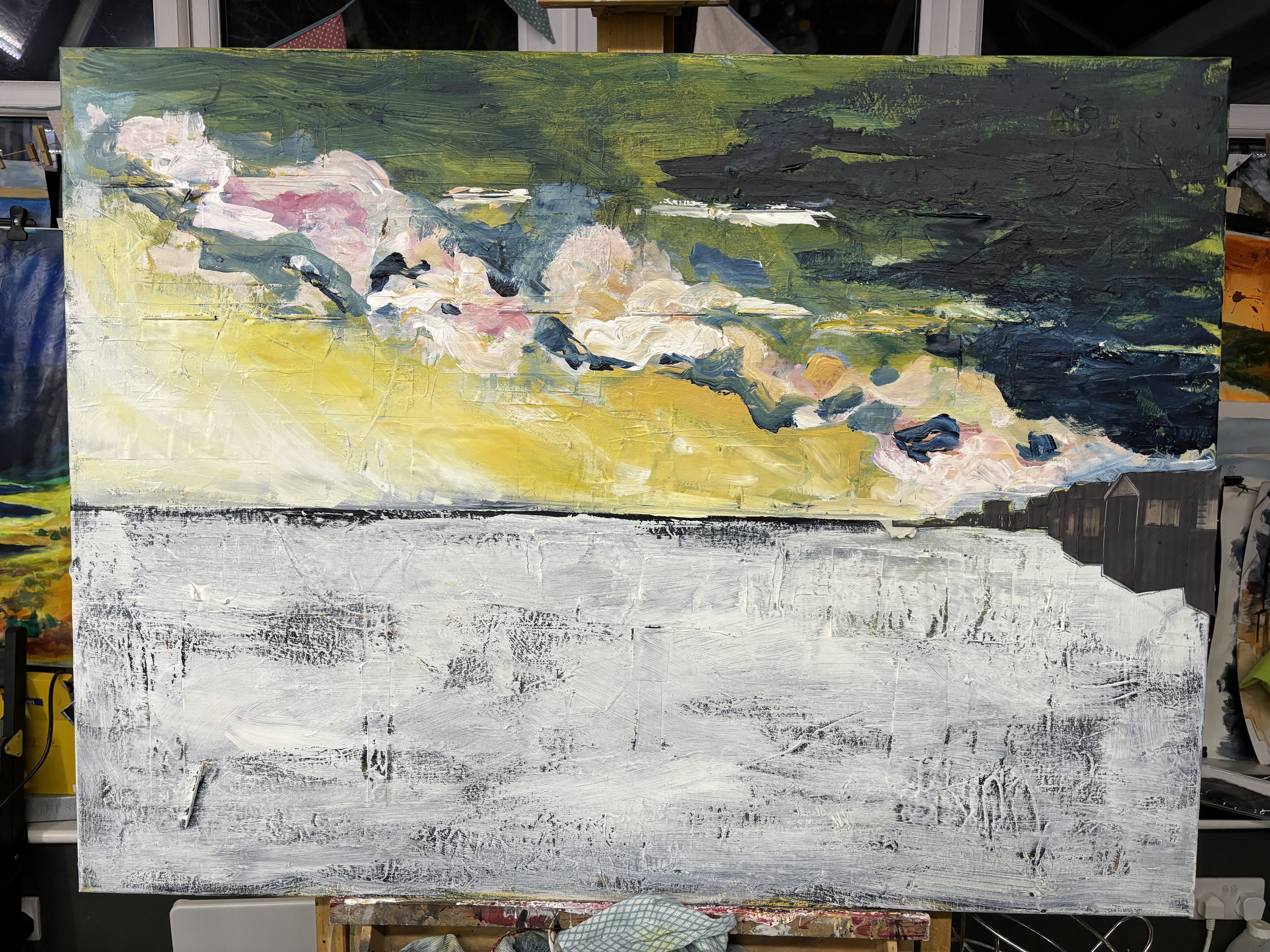 This is the combination for now, but I’m not happy with the overlay so that is likely to change. In the meantime, another large canvas has had its memory wiped to accommodate the new painting. So here’s Lancing beach having a hard time in the dystopian future.