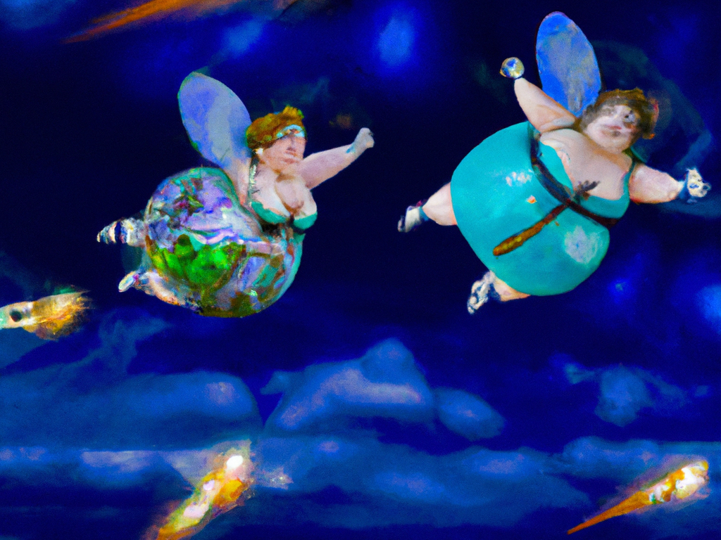 My work increasingly comprises physical, digital, and hybrid layers, including film and audio, all of which I make myself**, and I have argued similarly that, just as I consciously direct the movements my hand makes on canvas, I also direct the behaviours of the apps I use to determine, for instance, where and how animation operates, how saturation levels or opacities work, and whether layers appear as whole entities or through greenscreen windows. I find it difficult to see how this differs from classical painters delegating particular elements of their work – hands, feet, backgrounds – to apprentices (see the Milan Institute article ‘From Apprentice Artist to Master: Art Lessons From Da Vinci’ 2020). I exclude text-driven AI art such as DALL-E because even though I am providing the prompt and then selecting the best representation of that prompt, I have no [literal] hand in the result. I do, though, have a soft spot for one image DALL-E made when I fed it a bit of fiction about Fat Fairies saving the world. Clever DALL-E.