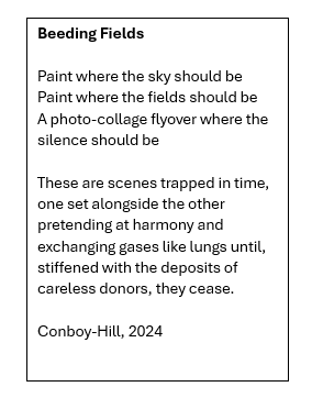 Note 2: Re the text boxes, see https://conboyhillarts.com/2023/12/17/stage3-unit-2-site-audience-context/ earlier in this blog where I talk about the way in which labels for artwork changed from stiff and unhelpful to communications with an audience; “[L]abels – or tombstones as they’re called – for paintings in galleries have a standard format which includes a word count [75 words]. Intuitively that seemed right but I had never seen anything evidential or that might constitute a guide until this week on Sky Arts’ Portrait Artist of the Year. It seems while the word count is critical, the style is up for grabs and a document from the V&A describes the shift from ‘curators talking to curators’ to a much more public-facing and accessible description. Some are poems.” My words. The V&A document has sadly vanished from its end of the link.