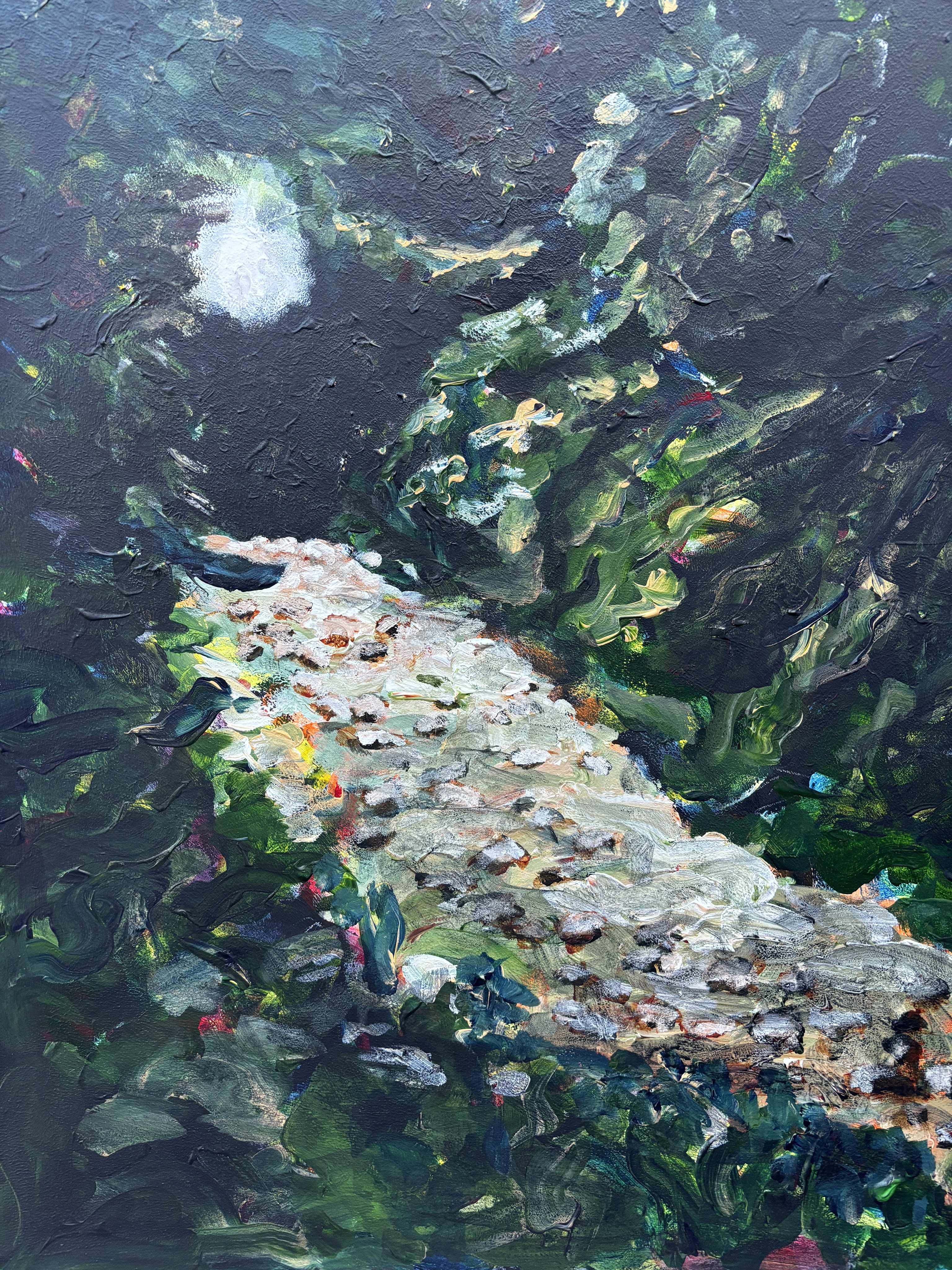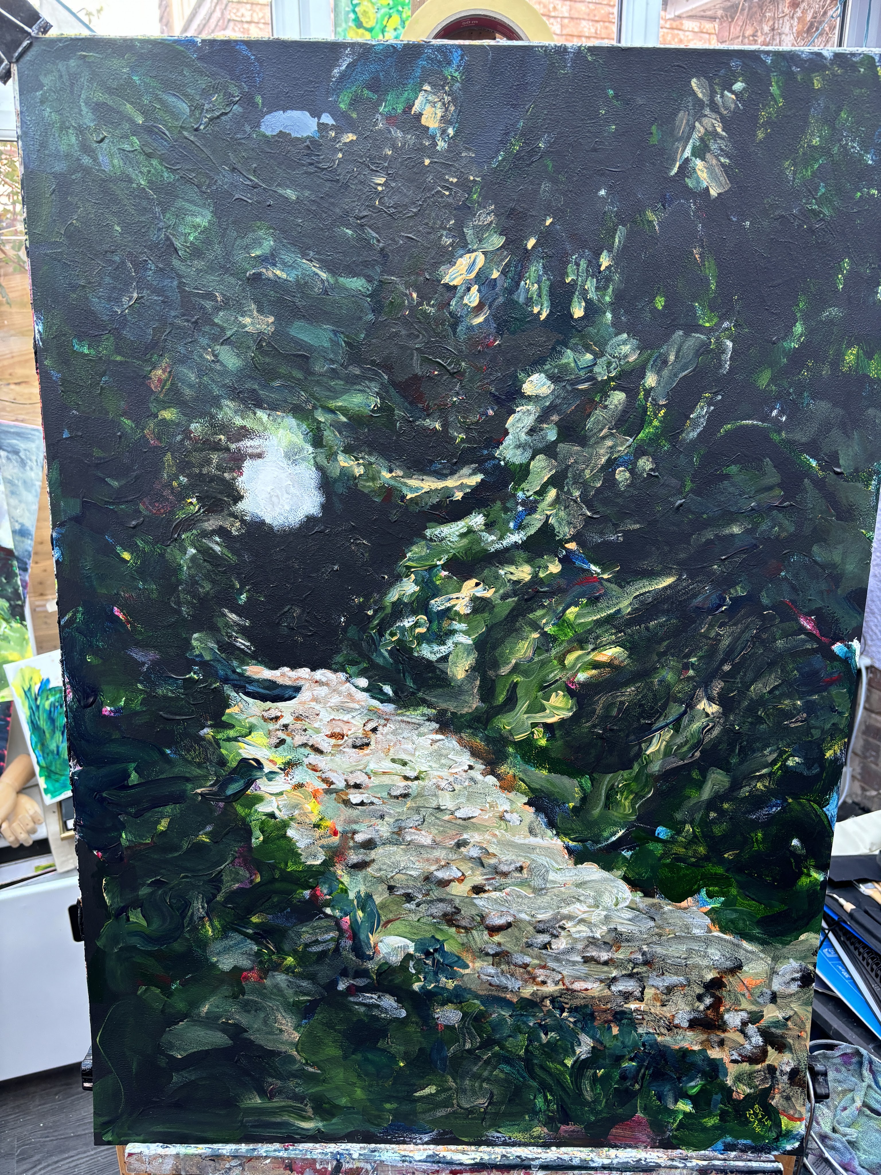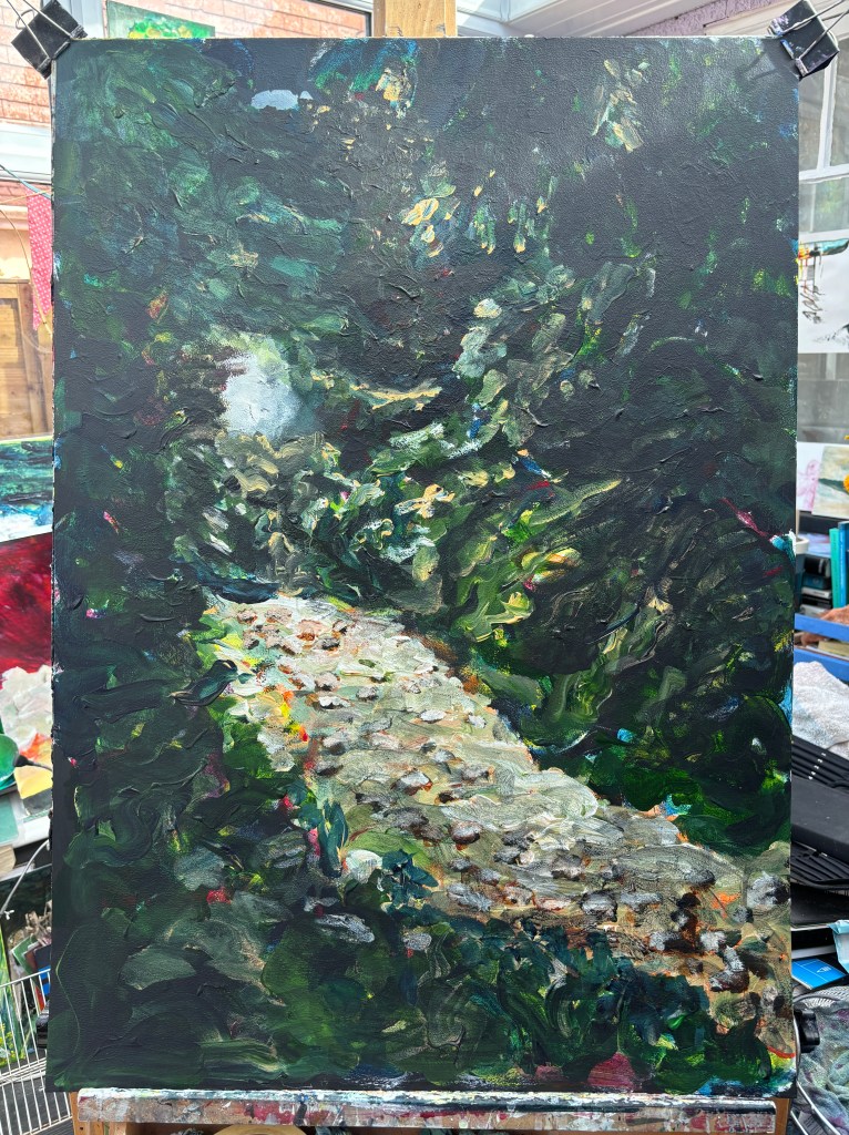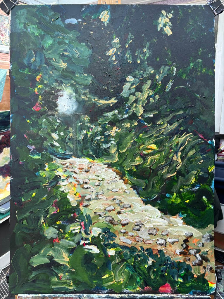 This says to me that, while stark black works well in a photo, it’s less successful in a painting, or at least in this painting. There is, in fact, a couple of large shrubs that fill that space so I think I’ll bring them in.