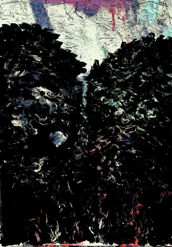 Then the bright green of the pathway, or whatever it has become, seemed ill-fitting so I have muted it but I odn’t know what it is any more. The texture underlying the white-out of the sky is interesting me and I’m wondering what to make of it. I have a burning desire to scrape a piece of charcoal across it and although that might be reckless, it might also be revelatory.