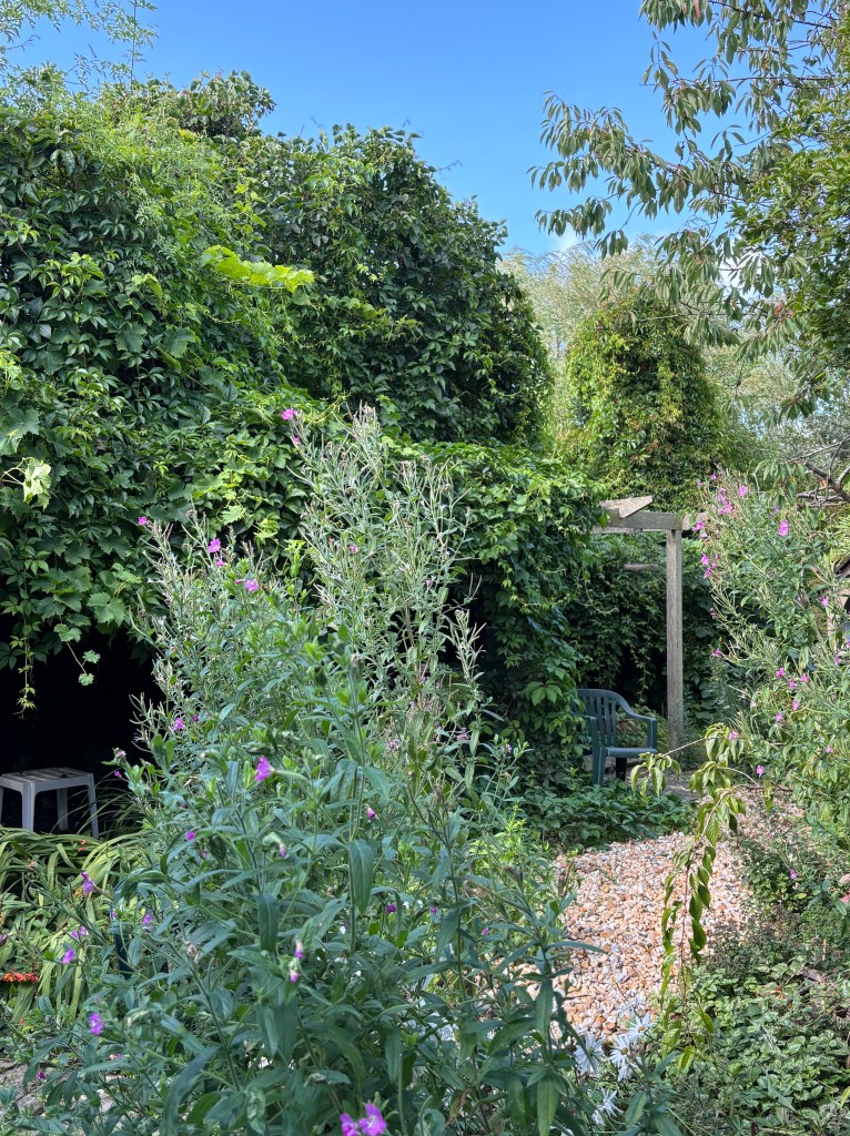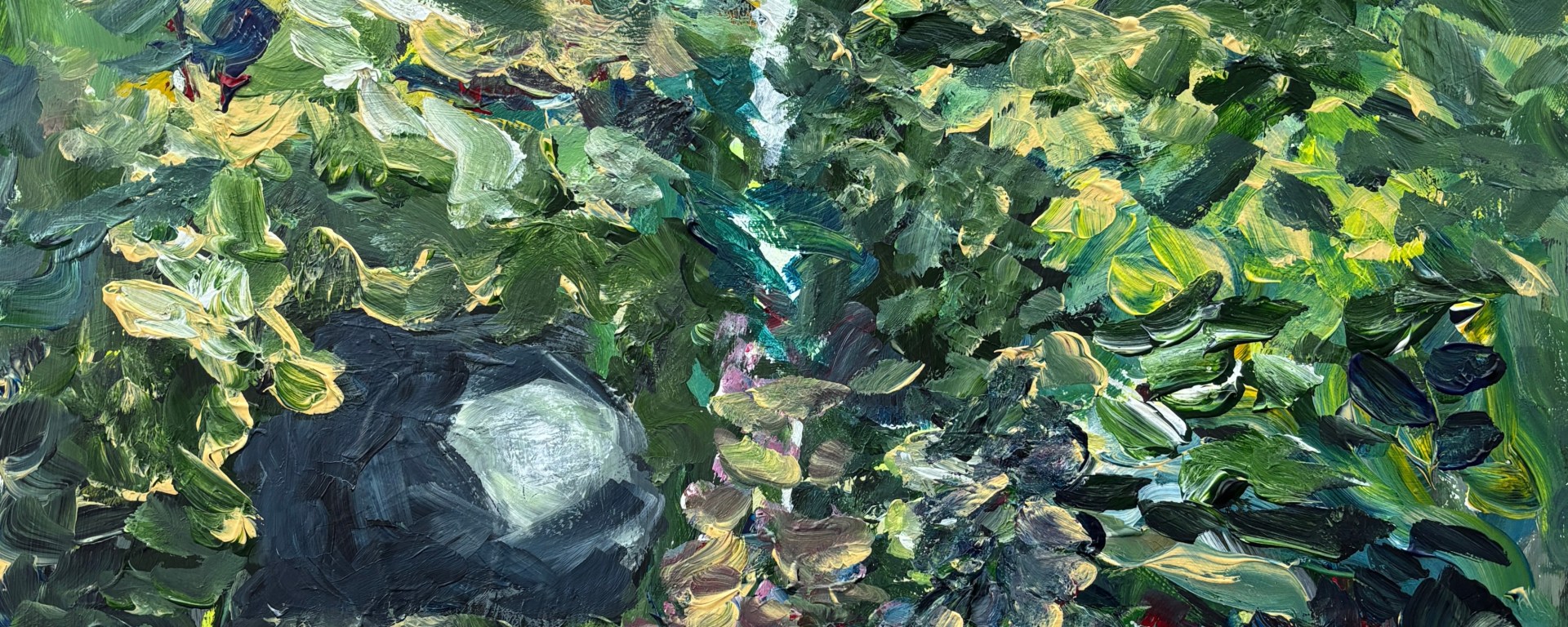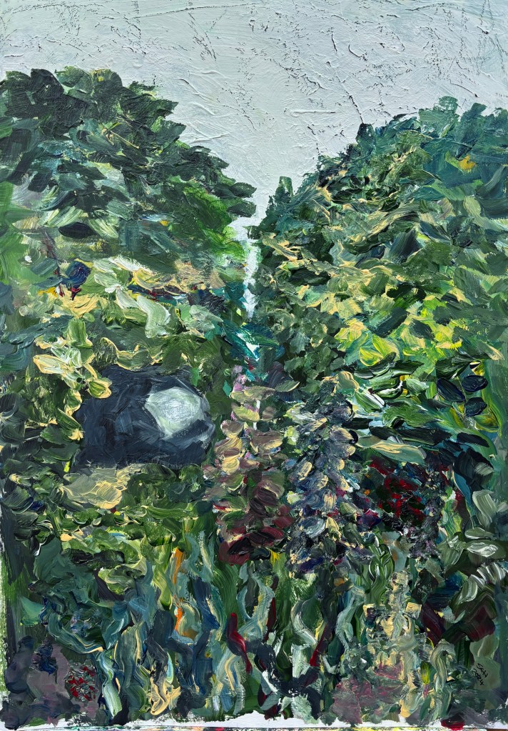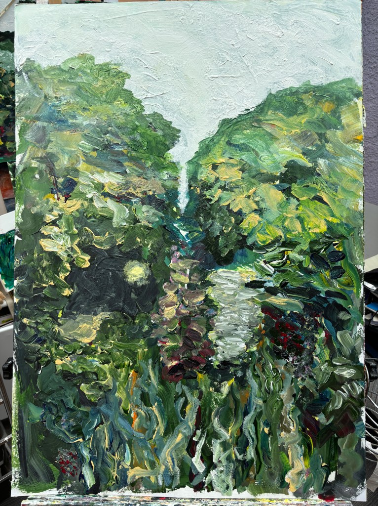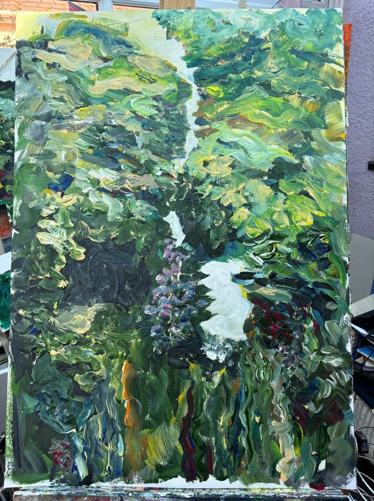 I am struck by the way painting takes the same shape for me as writing. I begin with an idea, in this case an image from the real world, which creates the structure and, just like writing fiction, I have no clue as to where it’s going. I apply paint in accordance with the structure and the nature of the subject matter until suddenly, a new narrative emerges. Quite often, that comes from seeing it as a photo because photos offer social distance and also a reduction in the temptation to become absorbed in detail. I see the shapes and how the colours I’ve chosen enable or disguise them. This frequently takes my imagination away from the initial reality and into something different, often just slightly surreal but not enough to unsettle. This fictional foliage is as chaotic as summer sun and rain have contrived to make my garden, although I’ve given it much more leeway to spread in its fictional form. The sky river can only exist in elevated canopies and wet conditions although in this instance, who’s to say it’s not interplanetary?