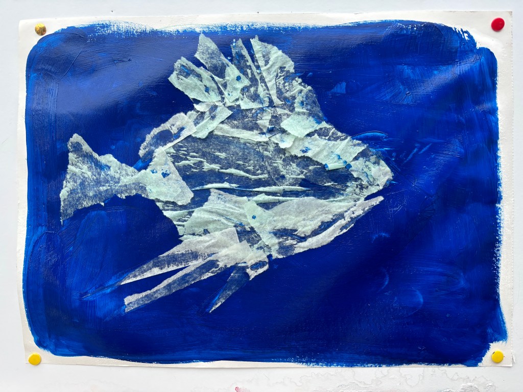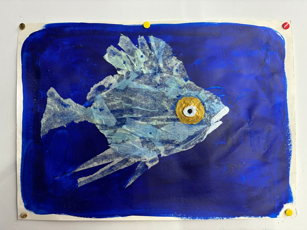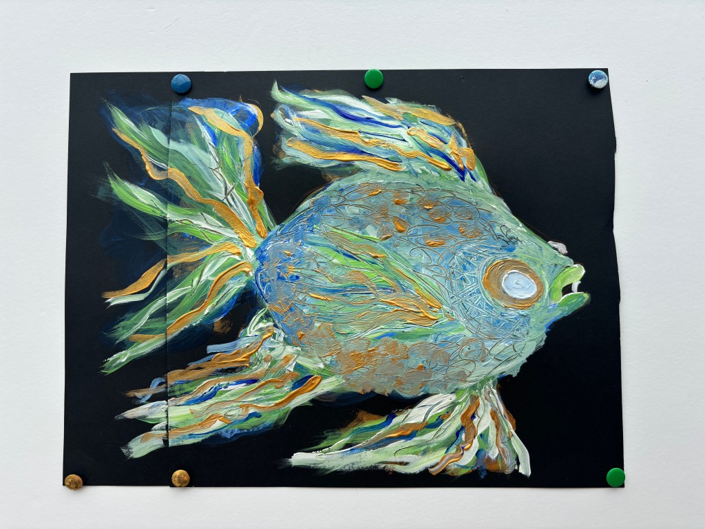 Prototype demonstrating my inability to consider the whole object before investing in most of the drawing. There was a lot to like here in terms of colours and flow, and the scratching into wet medium to make patterns.But ignoring all that, this is collaged tissue paper on damp acrylic. And you’re all going to think I should have stopped here. But I didn’t.I have some gold paint that far exceeded expectations when I used it for my Christmas painting. This is good and thick and covers the surface well. Pebeo studio acrylics, high viscosity metallic, irridescent. You’d imagine it would have the colour name on the tube but I can’t see it. Luckily, my Amazon receipt isn’t so reticent, it says Rich Gold.I’ve soaked dilute colours into the tissue here, and emphasised the eye which, in fish, which on the whole don’t blink, are prominent and staring. I inadvertently made my fish cry by being too quick to add to the pupil before the rest had dried. I’ve used acrylic pen to draw round the eye and the lips, going for something straddling reality and ornament.Lights are always tricky. I was about to minimise these dots of white but then saw the unreality of them as another feature of fish. Not cuddly, not sit-on-your-lap pets, something that vegetarians sometimes inexplicably find acceptable to eat, almost alien even at the surface and much more so at depth. This is where the idea for the video began.Some tiny edits, mostly to the light in the eye.