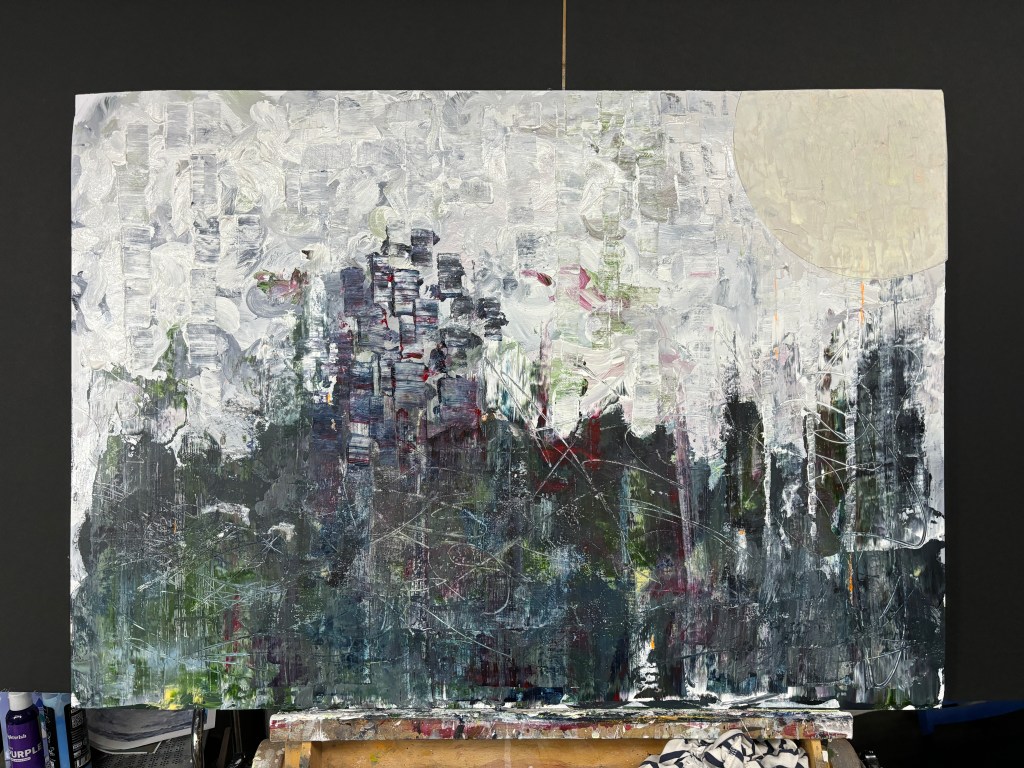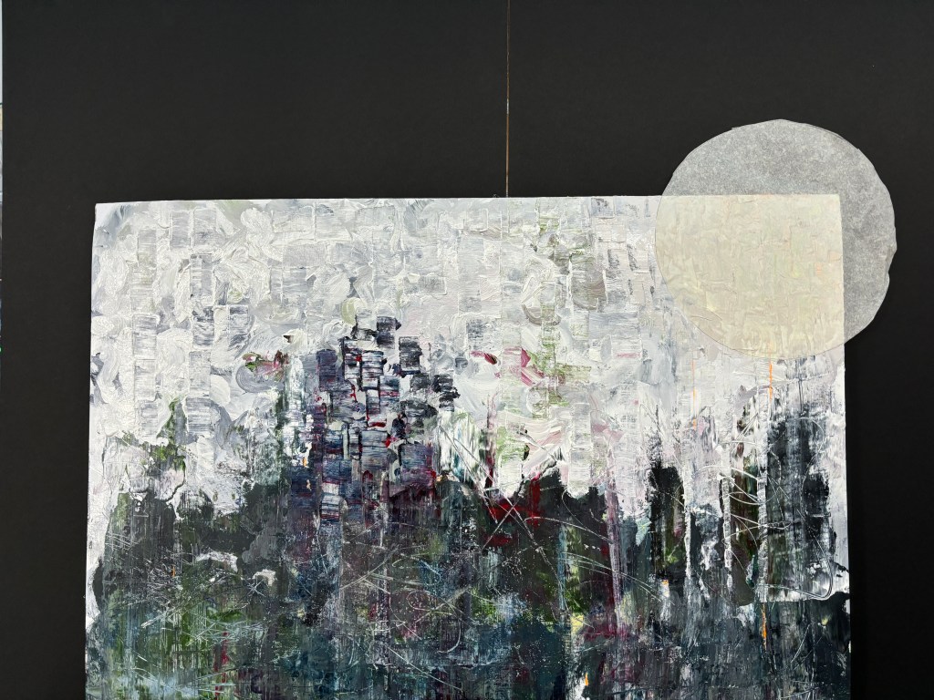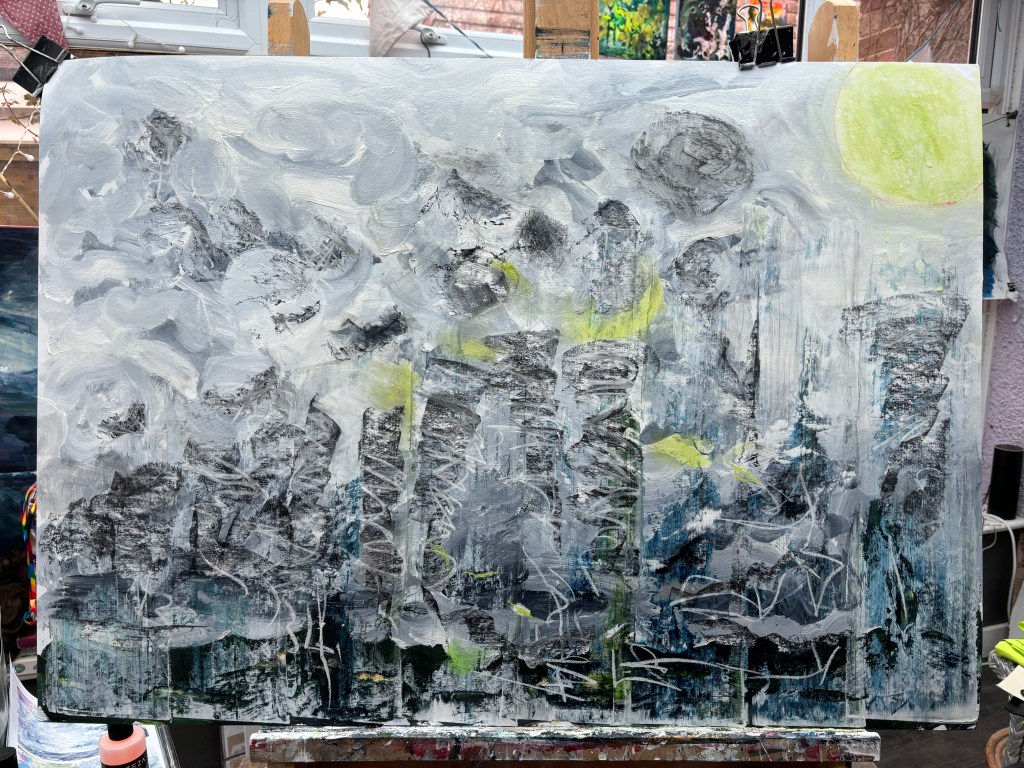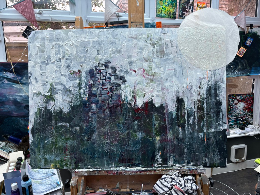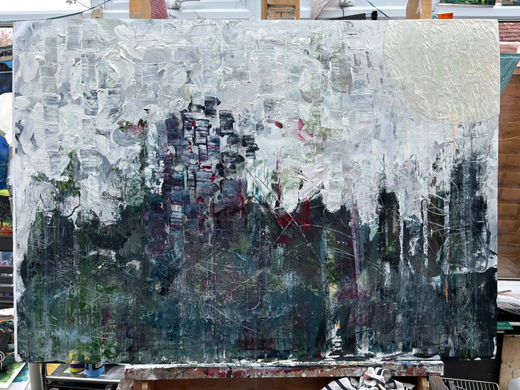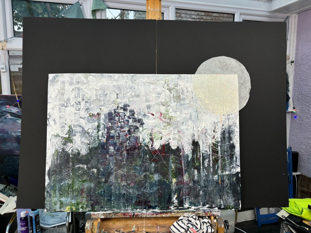 A little twee as it stands so the photo is a ‘just in case’ before I take off the edges of the NEO to leave it wholly inside the painting. The tissue is nicely buckled where it sits on the wet paint and I suspect I can work with that. I have to keep reminding myself that this is an object that may be space debris, an asteroid, or a small moon nudged out of its own orbit and thrown at our planet. It isn’t the sun, it doesn’t need to be on fire, it doesn’t even need to be round. And it should probably be some kind of lumpy grey rather than pale yellow.