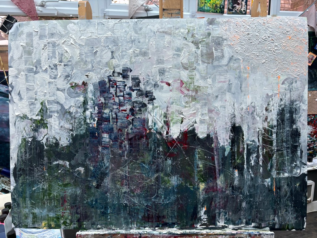 So here is a chaotic scene of roiling skies, tornadoes or water spouts, and drifting, unanchored graffiti which might lend itself to 3D in an AR layer. There may be smoke here too; hints of our industrialisation which both brought us into the modern era of technology but which would destroy us if the hypothetical NEO didn’t ELE us first. It’s evening here so the light is LED and not natural, which is why everything is slightly drained of colour. I’m intrigued to see some of the tornadoes have the look of snakes in a bottle, while others give the impression of being badly designed buildings that are now getting their come-uppance. The yellow/green pastel is satisfyingly lurid.