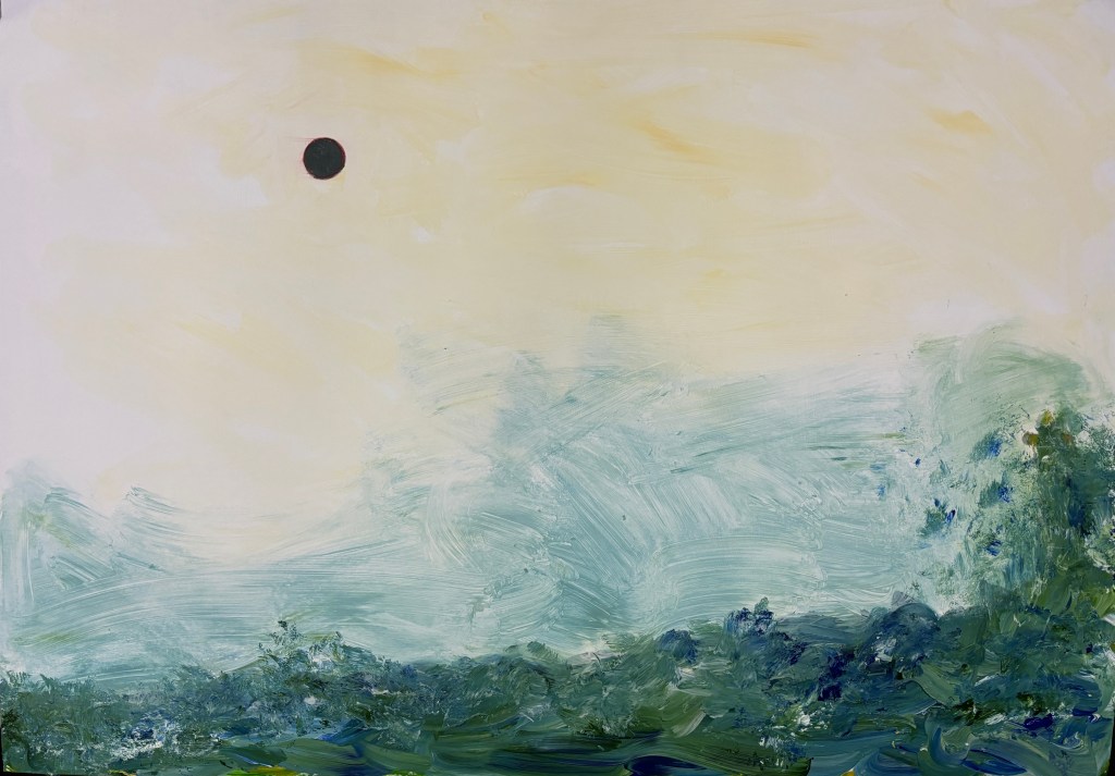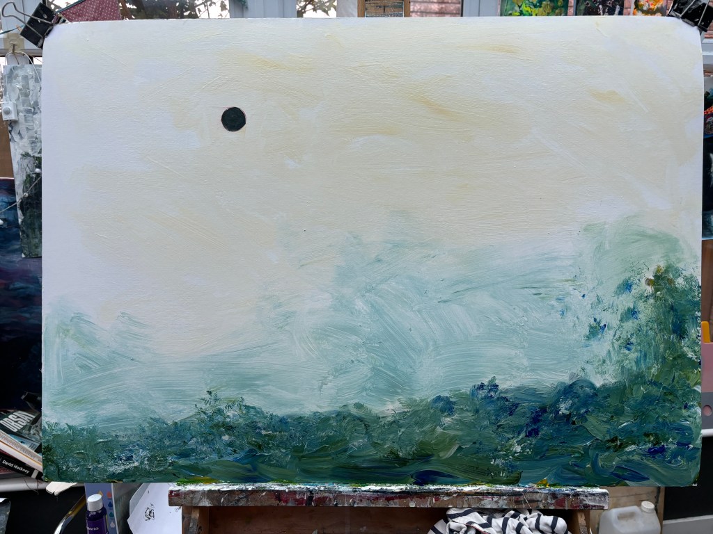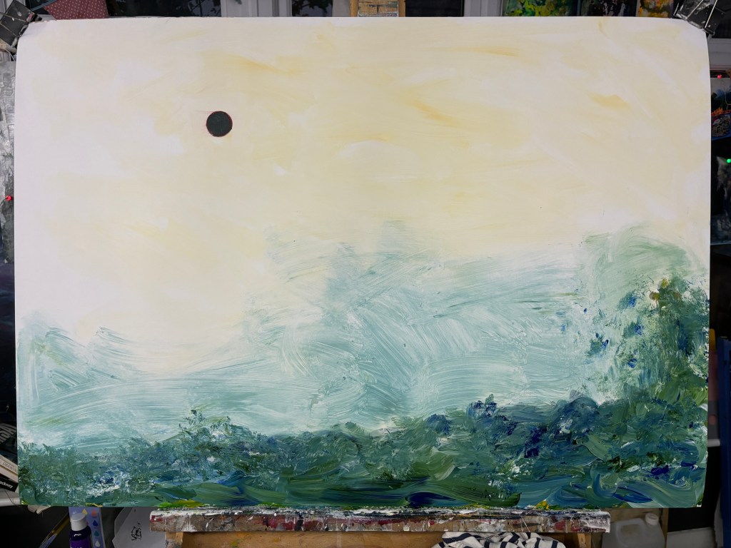 Using the same foreground shapes and palette, I’ve reduced the chaos of the scenes that follow in the series although they were painted and posted earlier. Call it a glitch in the time-space continuum. The media include watercolour pencil, tube acrylics and a blended wash of Naples yellow with titanium white Lascaux Aquacryl. The temptation would have been to use a brighter yellow with some inherent drama to it, but I was imagining this planet appearing in the early morning of a summer’s day where the colours are soft yet still energetic.