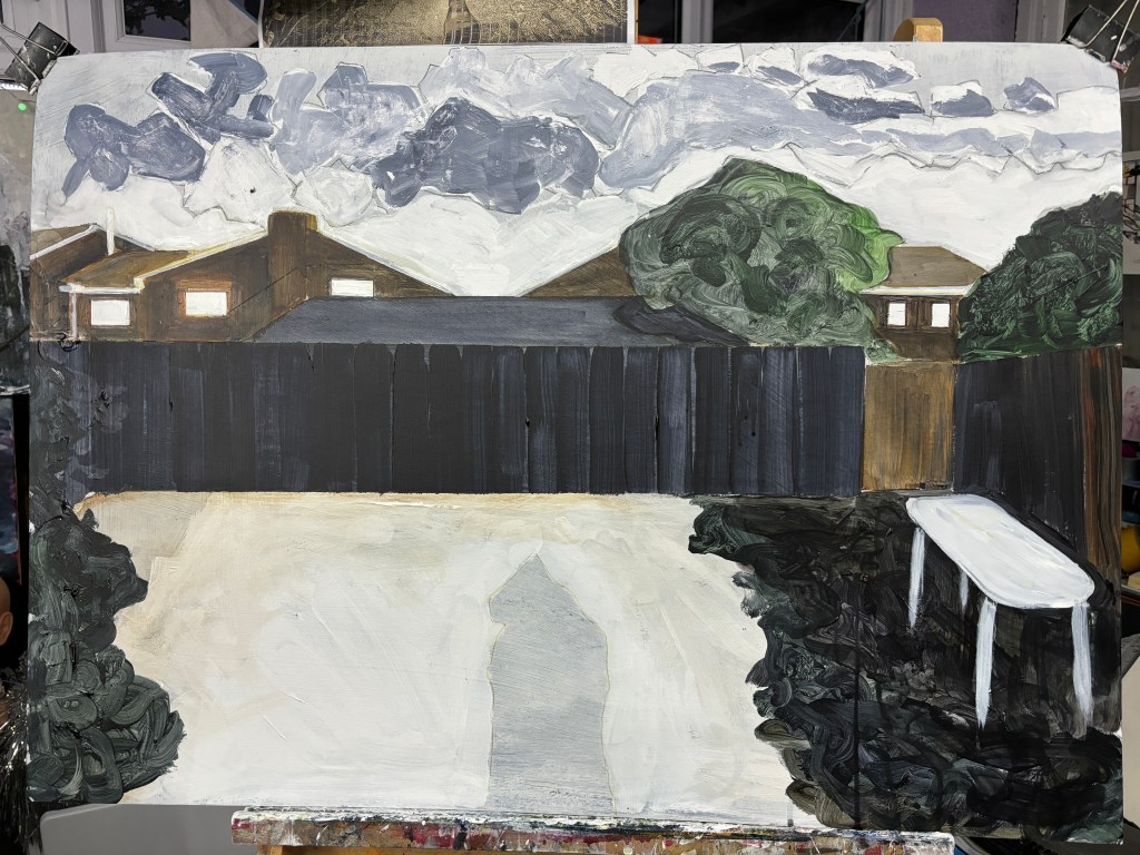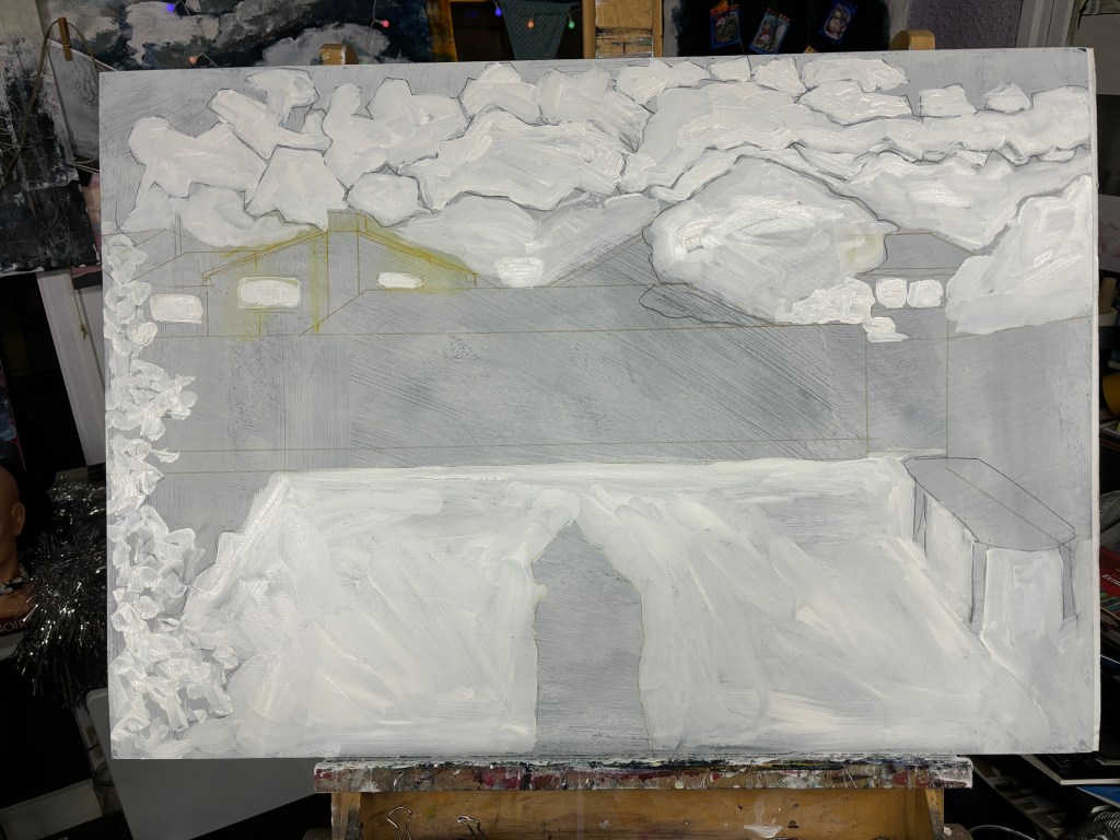 LED lights and I’m less happy with the sky. I think the flat white worked better. Tomorrow I’ll try to flatten that and restore the white with the pencil outlines. I’d really like the blue cast back though! Blue wash maybe, via a few test patches.