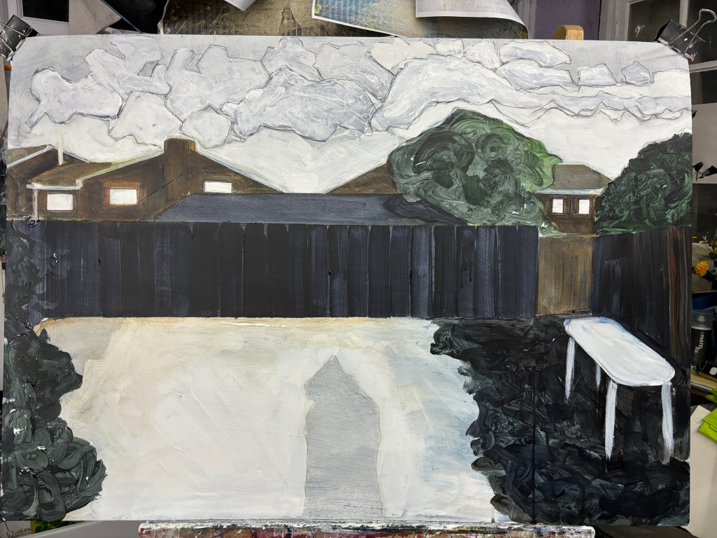Sandpapered and repainted clouds, blue wash to the fences and foliage, and some watercolour pencil outlines. I like that the shadow looks sinister, that the clouds look like rocks or whales, that the table seems as though it might run off at any moment and has an air of Big Dog about it, and that the windows are unblinking. I’m not sure I’ll ever look at this part of the garden the same way again!