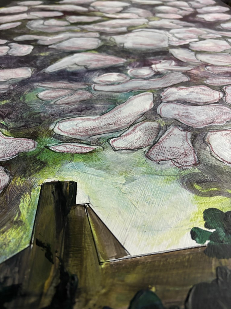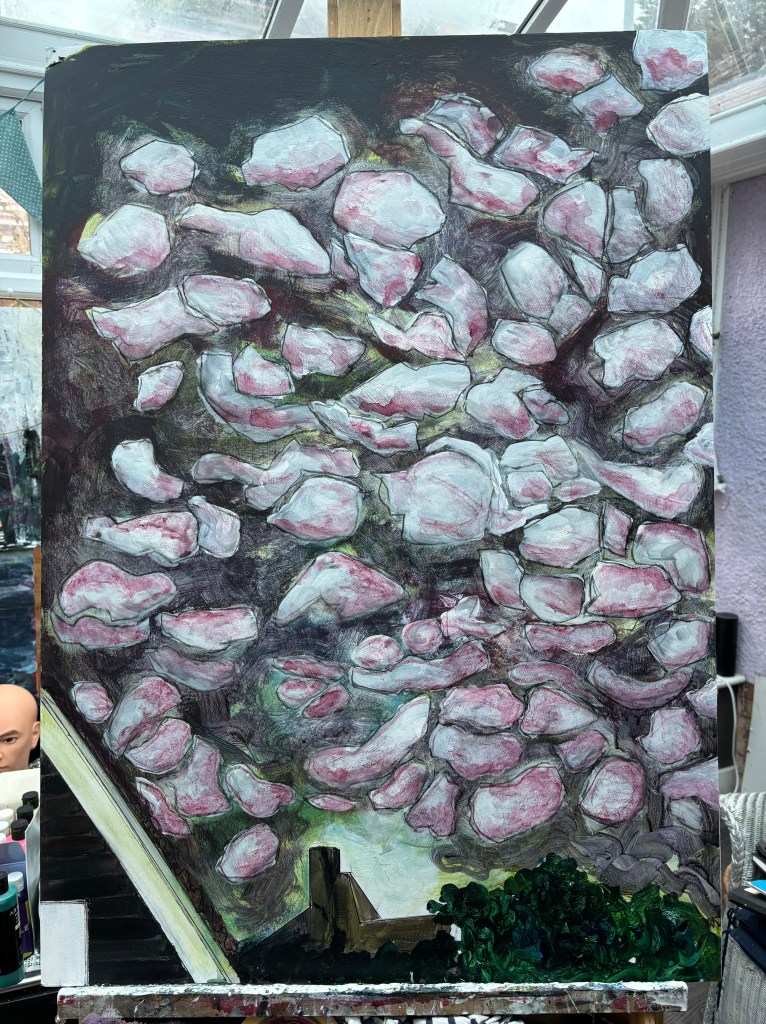 The painting remains prone while its watercolour pencil pink aurora stabilises. Then we’ll see if it’s staying.