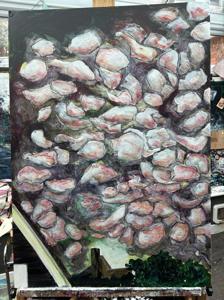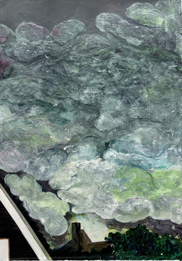 I’ve loved this and hated it in equal measure but now I feel as though the sky connects to the ground through a central line and speaks to the glow behind the houses. My painting style is present, this time as a roiling scrub rather than a fluid slither, and the weight is there but without its substance.