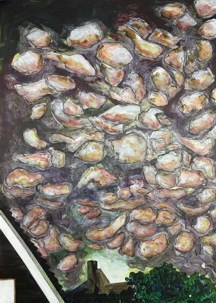 I discovered, after a bit of experimentation using fixative and varnish, that watercolour pencil doesn’t hold its raw form if any kind of solvent touches it so I had to concede defeat and let all of the pencilled areas run and blend so I could seal the surface. This resulted in a much more sinister appearance which reflects very much some of those cosmological references I made earlier. Imagine looking up one night and seeing this shuffling herd of bricks and boulders in the sky.