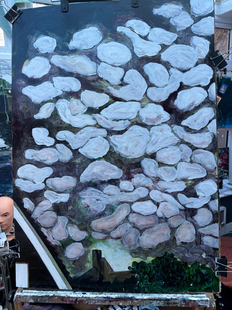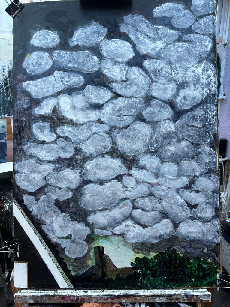 20th November. Yesterday I was looking at this, varnished and pristine hanging in my studio and thought, nope, I don’t like those clouds. So today I took them back to basics, to cloud qua cloud as it were.