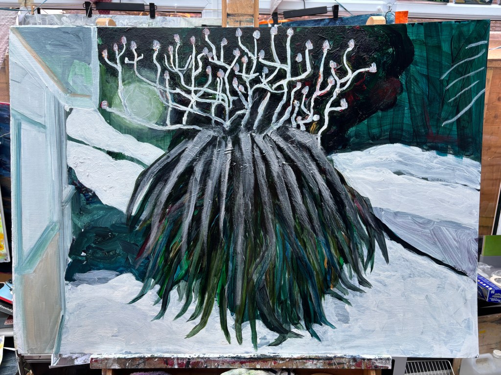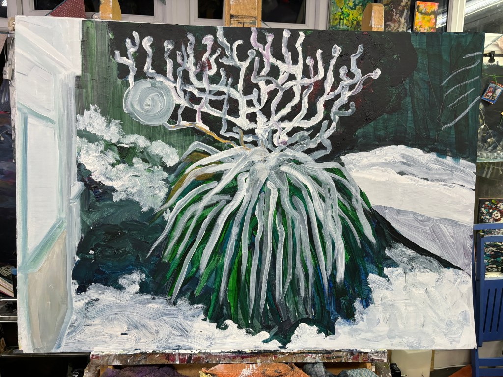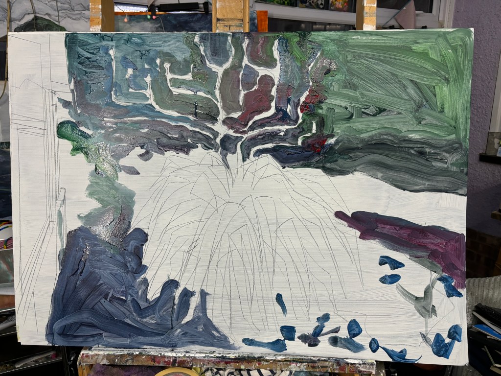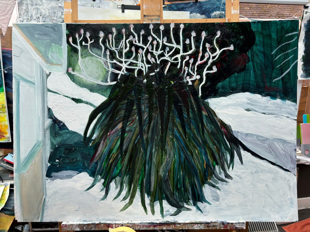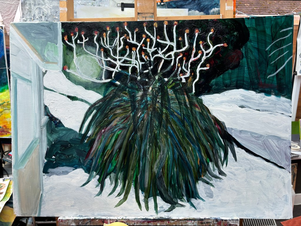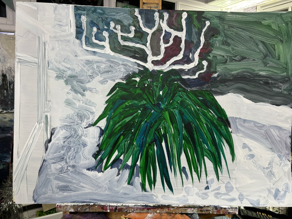 This is leading me down another path and suggesting I darken the foliage rather than lighten it. The upper leaves, emerging from the crown, have the look of spider legs and I want to darken the ones beneath a little now where these are under the ‘legs’. A bit of a Paynes Grey wash should suffice. Might use it to make a hint of a large body.