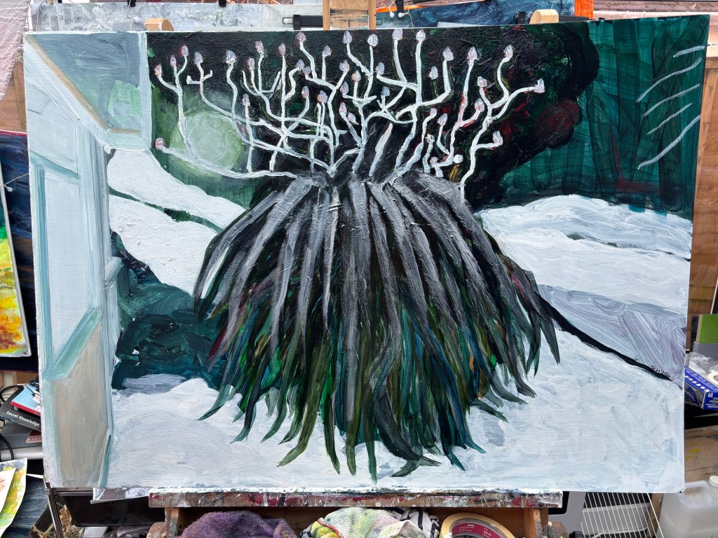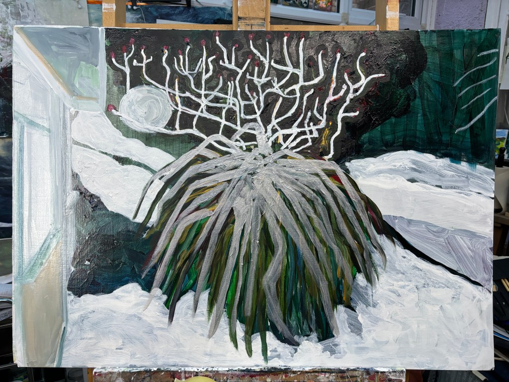 The large leaves of the Phormia are also frost and snow covered but I’m considering some artistic licence to form a shifting corridor of colour and tone from top right towards the bottom left. The whole scene is surrealistic from the frost on the twigs top right, through the barely visible dark wooded area just beyond, the enormous tree that takes up much of the view now the Phormia isn’t there, then the Phormia with its wickedly sharp foliage and its crown of glistening antlers borrowed from the Rhus typhus behind it. With its leaves seeming to creep along the ground once they arrive there, this plant gives the impression it could pick up its skirts and tread its own path.