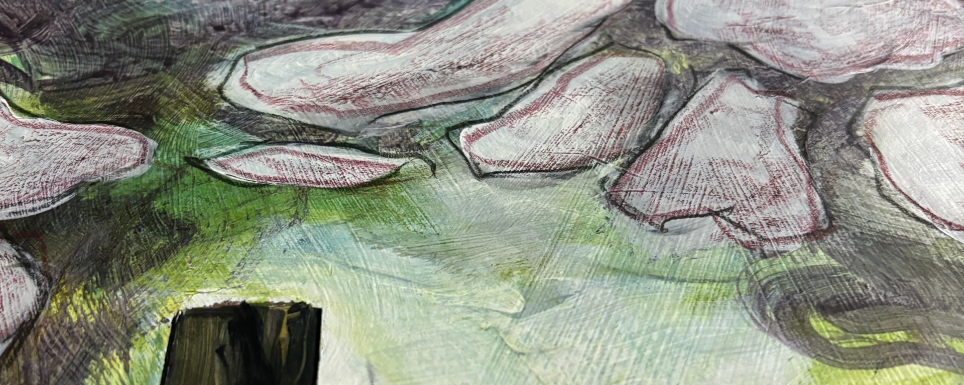 For this, I scrolled through my posts from December 2023 through to the present and, if sheer volume is a contributing factor to indications of progress, then progress has definitely been made! I began by counting the numbers of images per post and gave up when these became unmanageable without a spreadsheet. The number of completed images, as in paintings I deemed ‘done’ for project submission purposes, was my next criterion but even that was daunting. So I settled on impressions. Looking at where I began this unit, what the key growing edges were and how I might describe the point at which I’d landed.