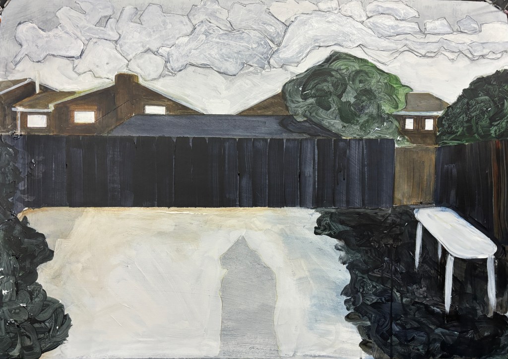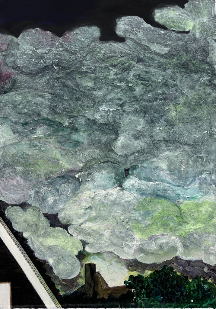 The painting process was a little less straightforward than many of my others in that a particular style suggested itself to me, which I quite liked but which rendered the clouds more as boulders than ethereal entities with no real form at all, and so it underwent some radical transformations via applications of varnish, layers of white acrylic, hints of pink, hints of green, minimisation of these, and some scouring to hint at folds. The end result places the focus just above the houses but with the weight of this cosmic influence hanging above.
