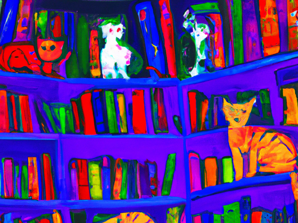 Featured image made in text-to-image AI Dall-ee using the prompts cats, library, Chagall.